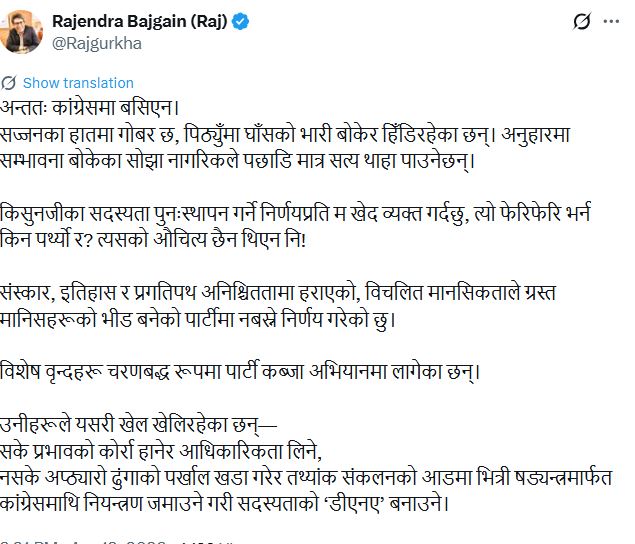 - बजगाईंले कांग्रेसको नेतृत्वप्रति असन्तुष्टि व्यक्त गर्दै सदस्यता पुनःस्थापनाको निर्णयप्रति खेद व्यक्त गरेका छन्।