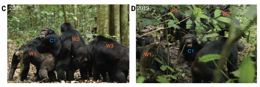 सन् २०१५ को २४ जुनमा अनुसन्धानकर्ताहरूले अनौठो दृश्य देखे । पश्चिमी र केन्द्रीय गुटका चिम्पान्जीहरू आफ्नो इलाकाको बीच भागमा झुम्मिए । सामान्य अवस्थामा उनीहरूबीच भेट हुँदा मिलेर बस्थे ।