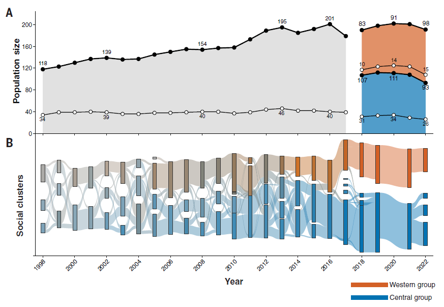 सन् २०१८मा पश्चिमी समूहमा १० वटा भाले र २२ वटा वयस्क पोथीहरू भए । केन्द्रीय समूहमा ३० वटा वयस्क भाले र ३९ वटा पोथी चिम्पान्जीहरू समूहमा थिए । यद्यपि केन्द्रीय समूहका पोथीहरू भने कहिलेकाँही पश्चिमी समूहका फलफूलका बोटहरूमा देखिने गरेको अध्यनयमा उल्लेख छ । सन् २०१८ पछि भने उनीहरूबीचमा कुनै पनि किसिमको सम्बन्ध नै बाँकी रहेन । उनीहरू पूर्ण रुपमा फरक र शत्रुतापूर्ण समूहमा परिणत भइसकेका थिए ।