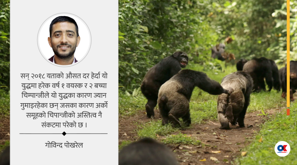 गत साता प्रसिद्ध साइन्स जर्नलमा एउटा अनुसन्धान छापियो । अनुसन्धान पढ्दै जाँदा मलाई निकै नै रोचक लाग्यो । अनुसन्धान थियो, चिम्पान्जीहरूको गृहयुद्ध । मानिसमा जस्तै चिम्पान्जीहरूको पनि गृहयुद्ध हुन्छ ? सुरुमा मलाई अचम्म लाग्यो, पढ्दै गएपछि ध्यान खिच्यो ।