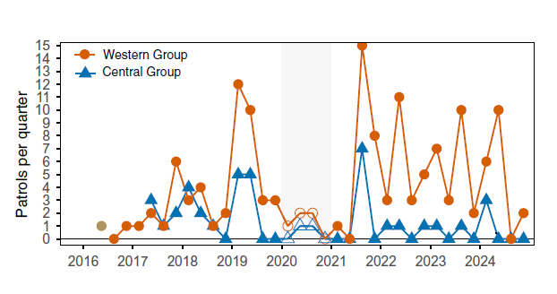 जसमा ६ वटा पोथी, ६ वटा भाले र २ वटा लिंग नुखुलेका थिए । यस्तै, अन्य थप ३ वटा बच्चाको पनि हत्या भएको अनुमान छ । औसतमा सन् २०१८ देखि २०२४को बीचमा पश्चिमी समूहले केन्द्रीय समूहका एउटा वयस्क भाले र २ वटा बच्चा हरेक वर्ष मारिरहेका छन् ।