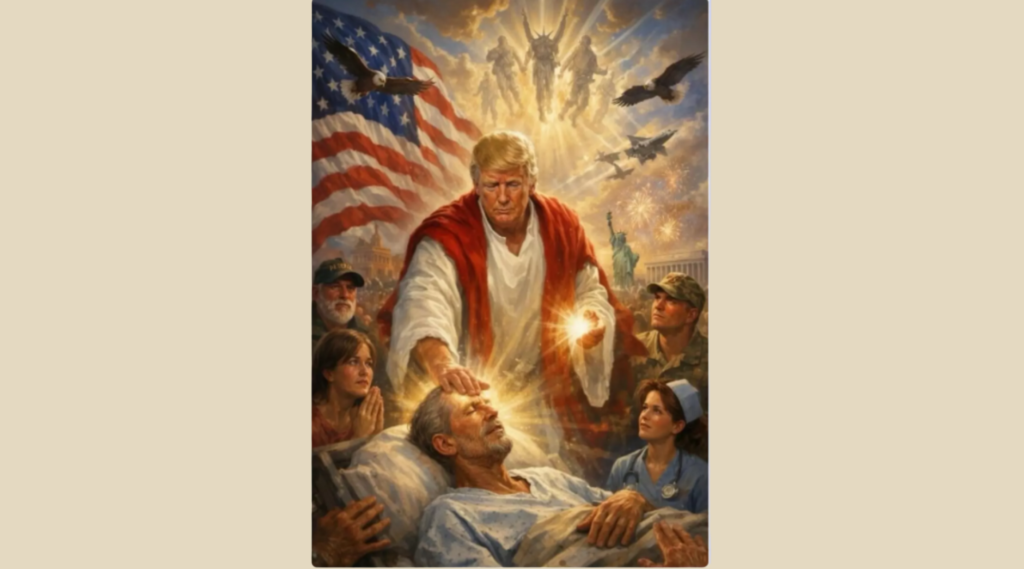 आइतबार ट्रम्पले आफ्नो ‘ट्रुथ सोसल’ प्लेटफर्ममा एआईद्वारा निर्मित एउटा तस्वीर पोस्ट गरेका थिए । उक्त तस्वीरमा उनलाई सेतो पोसाकमा एक दैवी शक्तिको रूपमा देखाइएको थियो । एउटा हातमा चम्किलो गोला थियो भने अर्को हातले बिरामी मानिसलाई निको पारिरहेको देखिन्थ्यो ।