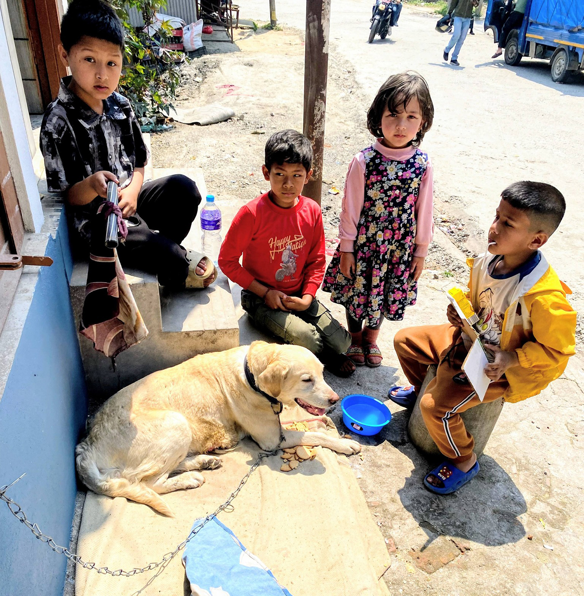 - स्थानीय बालबालिकाले घाइते कुकुरलाई आक्रमणबाट बचाउँदै विस्कुट र पानी खुवाएर पहरा दिए।