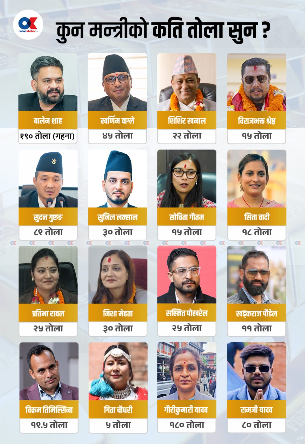 वर्तमान सरकारका प्रधानमन्त्री तथा मन्त्रीहरूकै सम्पत्ति विवरण अनुसार पनि सुनको परिमाण उच्च देखिन्छ । सार्वजनिक विवरण अनुसार बहालवाला प्रधानमन्त्री बालेन शाहसँग १ सय ९० तोला सुन छ । त्यसैगरी गृहमन्त्री सुदन गुरुङको सुन ८९ तोला, अर्थमन्त्री डा. स्वार्णिम वाग्लेको ४५ तोला, परराष्ट्रमन्त्री शिशिर खनालको २२ तोला, ऊर्जामन्त्री विराजभक्त श्रेष्ठको १५ तोला सुन भएको सम्पत्ति विवरण आएको छ ।