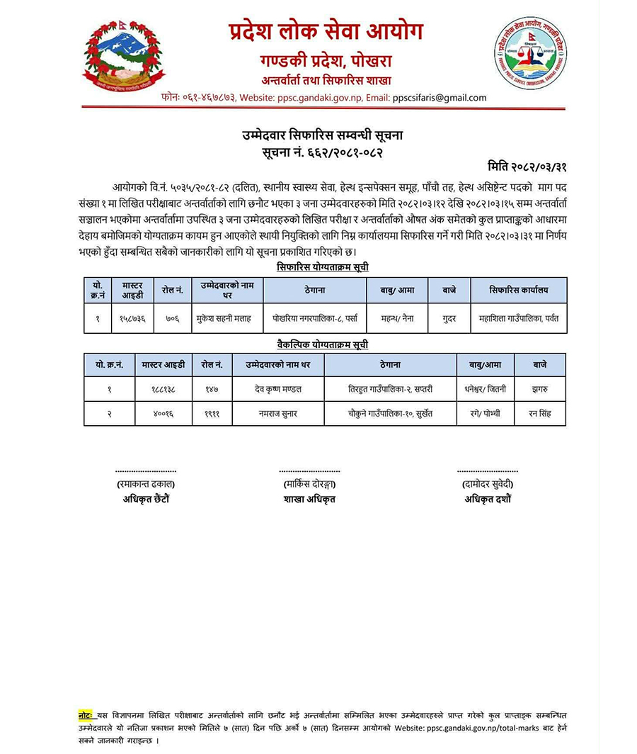 गण्डकी प्रदेश लोकसेवा आयोगले गत असार ३१ गते प्रकाशित गरेको नतिजाअनुसार पर्साका मुकेश सहनी मलाह दलित कोटाबाट उत्तीर्ण भई पर्वतको महाशिला गाउँपालिकाका लागि सिफारिस भएका थिए । तर सोही पदका लागि वैकल्पिक सूचीको पहिलो नम्बरमा रहेका सप्तरीको तिरहुत गाउँपालिका–२ का देवकृष्ण मण्डल उक्त सिफारिस नियमविपरीत भएको दाबी गर्दै न्यायका लागि विभिन्न निकाय धाइरहेका छन् ।