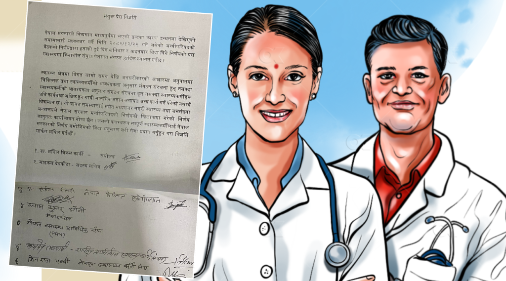 ‘लामो समयदेखि स्वास्थ्य क्षेत्रमा आवश्यक जनशक्तिको अभाव र संगठन संरचनाको कमजोरीका कारण चिकित्सक तथा स्वास्थ्यकर्मीहरू अत्यधिक कार्यबोझमा परिरहेको छ । त्यसबाट मानसिक तनावसहित विभिन्न समस्या उत्पन्न भइरहेको छ,’ विज्ञप्तिमा भनिएको छ ।