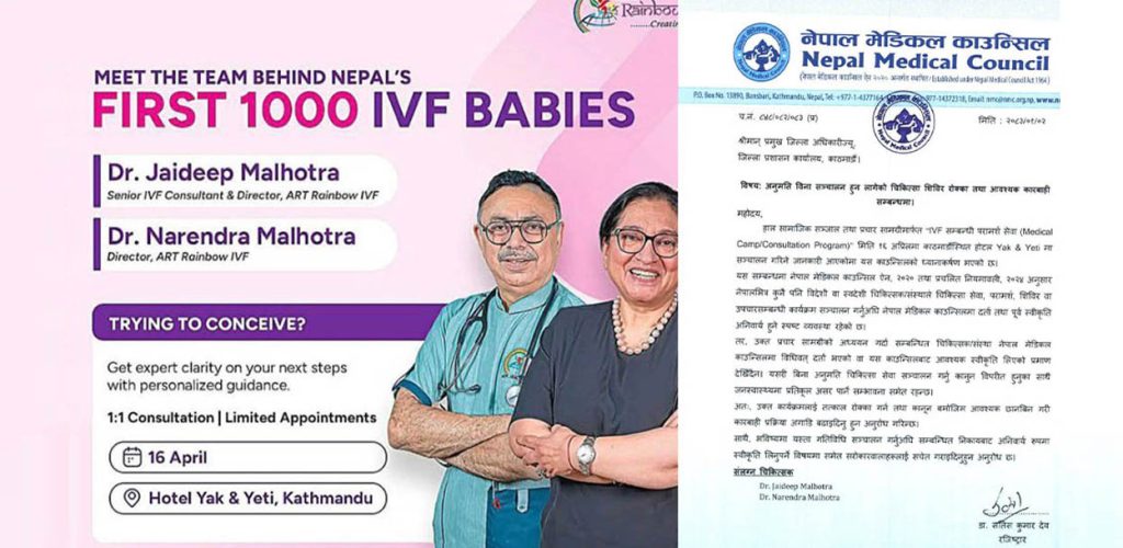 काउन्सिलले जिल्ला प्रशासन कार्यालय काठमाडौंका प्रमुख जिल्ला अधिकारीलाई सम्बोधन गर्दै शिविर रोक्न पत्र पठाएको हो । सामाजिक सञ्जाल तथा प्रचार सामग्रीमार्फत १६ अप्रिल (भोलि) होटेल याक एन्ड यतीमा आईभीएफसम्बन्धी परामर्श सेवा सञ्चालन गर्न लागिएको सूचनाप्रति गम्भीर ध्यानाकर्षण भएको पत्रमा उल्लेख गरिएको छ ।