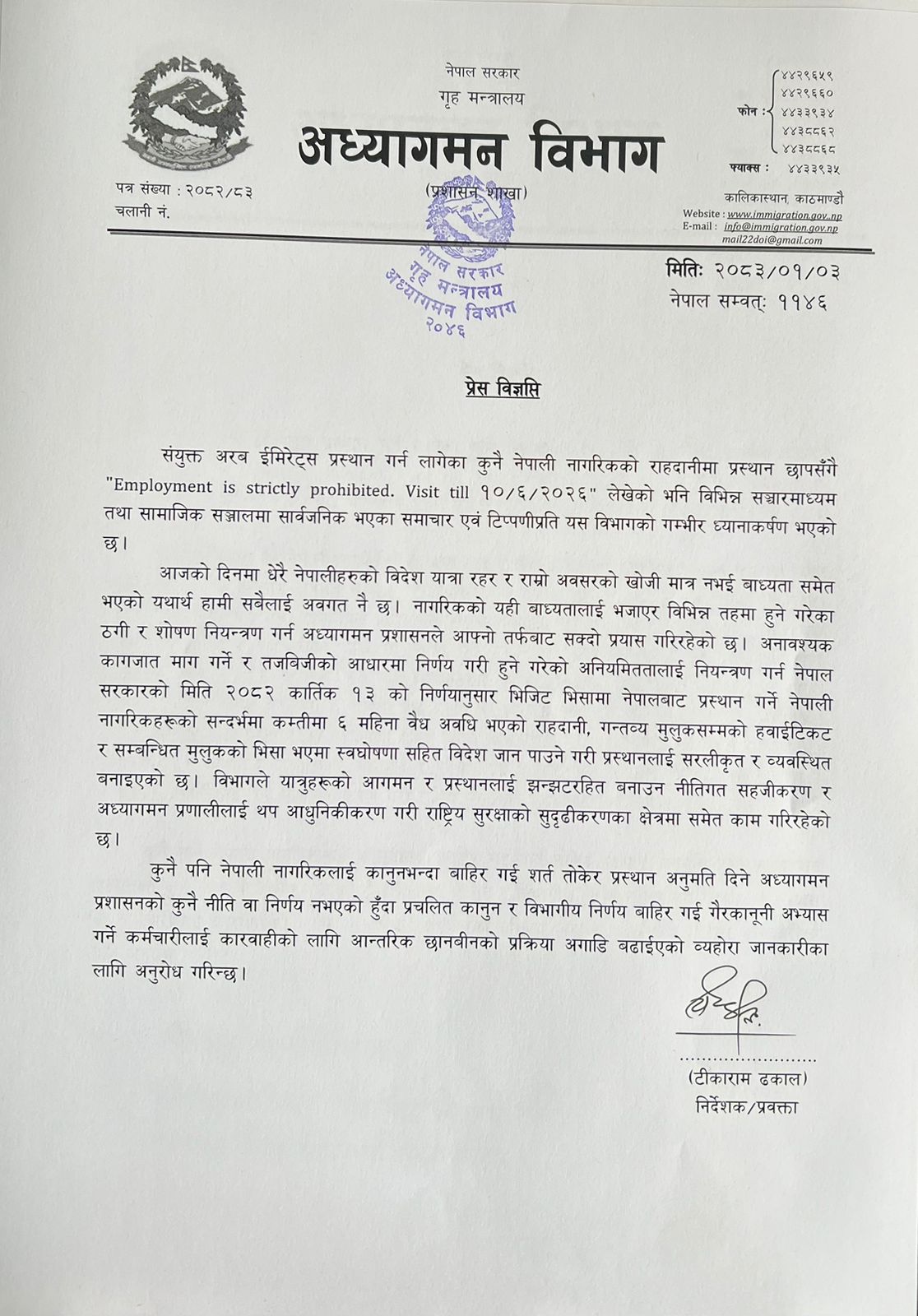 ३ वैशाख, काठमाडौं । गृह मन्त्रालय अन्तर्गत अध्यागमन विभागले युनाइटेड अरब इमिरेट्स (यूएई) प्रस्थान गर्न लागेका नेपाली नागरिकको राहदानीमा ‘इम्प्लोयमेन्ट इज स्ट्रिक्ट्ली प्रोहिबिटेड टिल १०/६/२०२६’ (१०/६/२०२६ सम्म रोजगारी पूर्णरूपमा निषेध) जस्ता टिप्पणी लेखिएको विषयमा गम्भीर ध्यानाकर्षण जनाएको छ ।