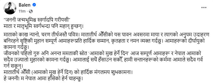 Generated by OK AI. Editorially reviewed.- प्रधानमन्त्री बालेन शाहले मातातीर्थ औँसीको अवसरमा फेसबुकमार्फत 'माता र मातृभूमि स्वर्गभन्दा पनि महान् हुन्छन्' भनेका छन्।