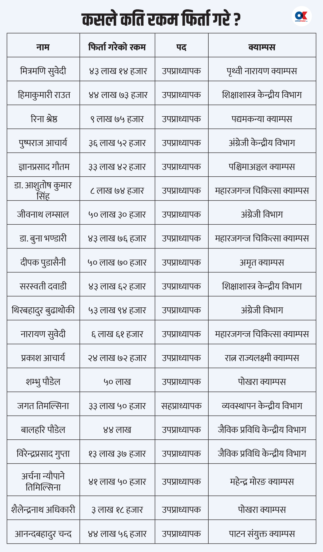 २० प्राध्यापकले फिर्ता गरे ६ करोड