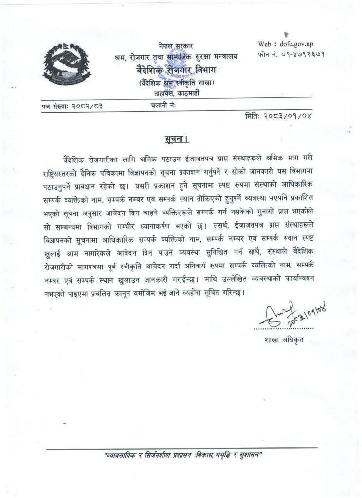 Generated by OK AI. Editorially reviewed.- वैदेशिक रोजगार विभागले इजाजतपत्र प्राप्त संस्थालाई विज्ञापनमा आधिकारिक सम्पर्क विवरण अनिवार्य खुलाउन निर्देशन दिएको छ।