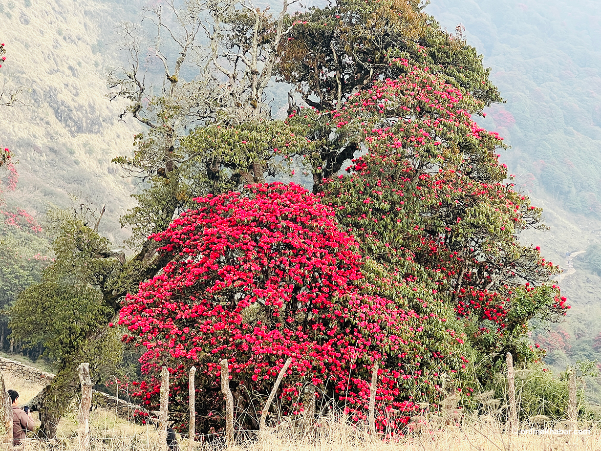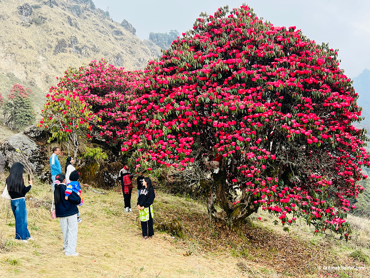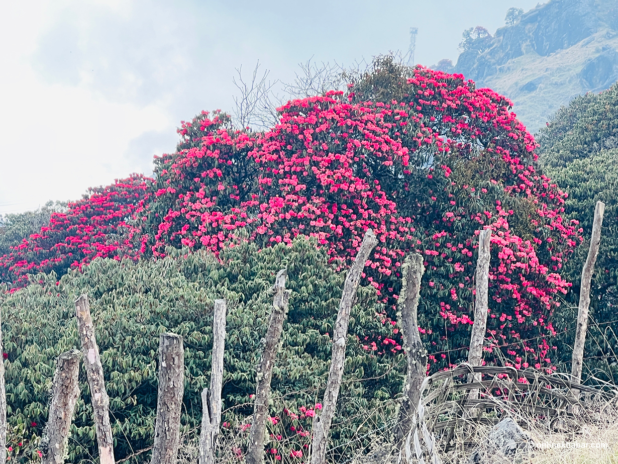 ६ वैशाख, तेह्रथुम । गुराँसको राजधानीका रूपमा परिचित पूर्वी नेपालको तिनजुरे-मिल्के-जलजले (टीएमजे) क्षेत्रअन्तर्गत पर्ने तीनजुरे पाथीभरादेखि पाँचपोखरीसम्मका डाँडापाखा यतिबेला गुराँस फुलेर राताम्यै बनेका छन् ।