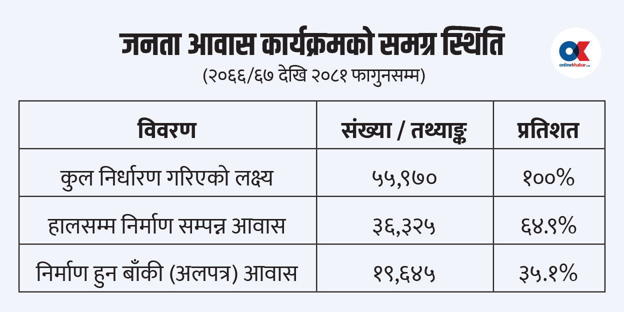 - जनता आवास कार्यक्रमले १६ वर्षमा ५५,९७० घरमध्ये करिब १९,६४५ घरहरू पूर्णतः अलपत्र छन् र २५ हजार अधुरो छन्।
