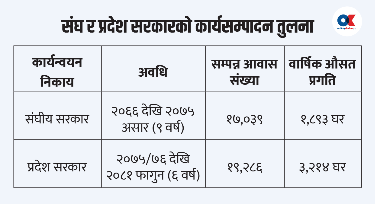 २०७५/७६ मा संघले प्रदेशलाई कार्यक्रम हस्तान्तरण गर्दा ३८,८८४ अधुरा घरहरूको भारी सुम्पिएको थियो। प्रदेश सरकारहरूले संघको तुलनामा केही गति बढाए पनि अझै करिब २० हजार घरहरू अलपत्र हुनुले संघीयताको डेलिभरीमा गम्भीर प्रश्न उठाएको छ।