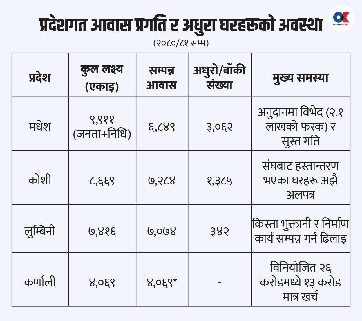 कोशी प्रदेशको अन्योल र संघ-प्रदेश समन्वयको अभाव : कोशी प्रदेशको अवस्था पनि उत्तिकै निराशाजनक छ, जहाँ कुल लक्ष्यको १५ प्रतिशतभन्दा बढी अर्थात् १,३८५ घरहरू अझै निर्माणको पर्खाइमा छन्। यहाँको सबैभन्दा बिझाउने पक्ष भनेको संघीय सरकारबाट हस्तान्तरण भएका ९८४ घरहरू लामो समयदेखि अलपत्र पर्नु हो।