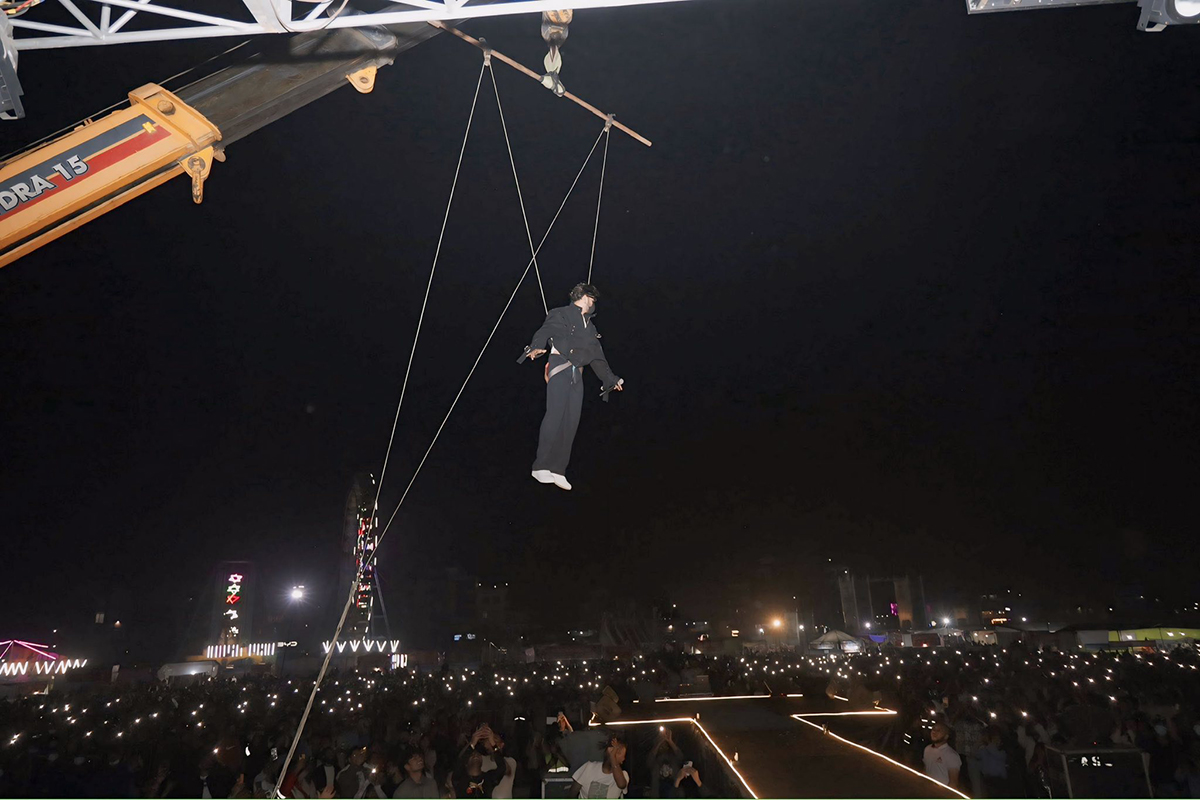 पृष्ठभूमिमा ‘दुस्मन हेरेको हेर्यै’ बजिरहेको थियो । त्यहाँ विकास निर्माणमा प्रयोग हुने पहेँलो रङको एउटा क्रेन देखा पर्यो । त्यसमा डोरीहरूको सहायतमा झुन्डिँदै थापा देखिए । तल रहेका दर्शकहरूले उनलाई ‘हो…’ ले स्वागत गरे ।