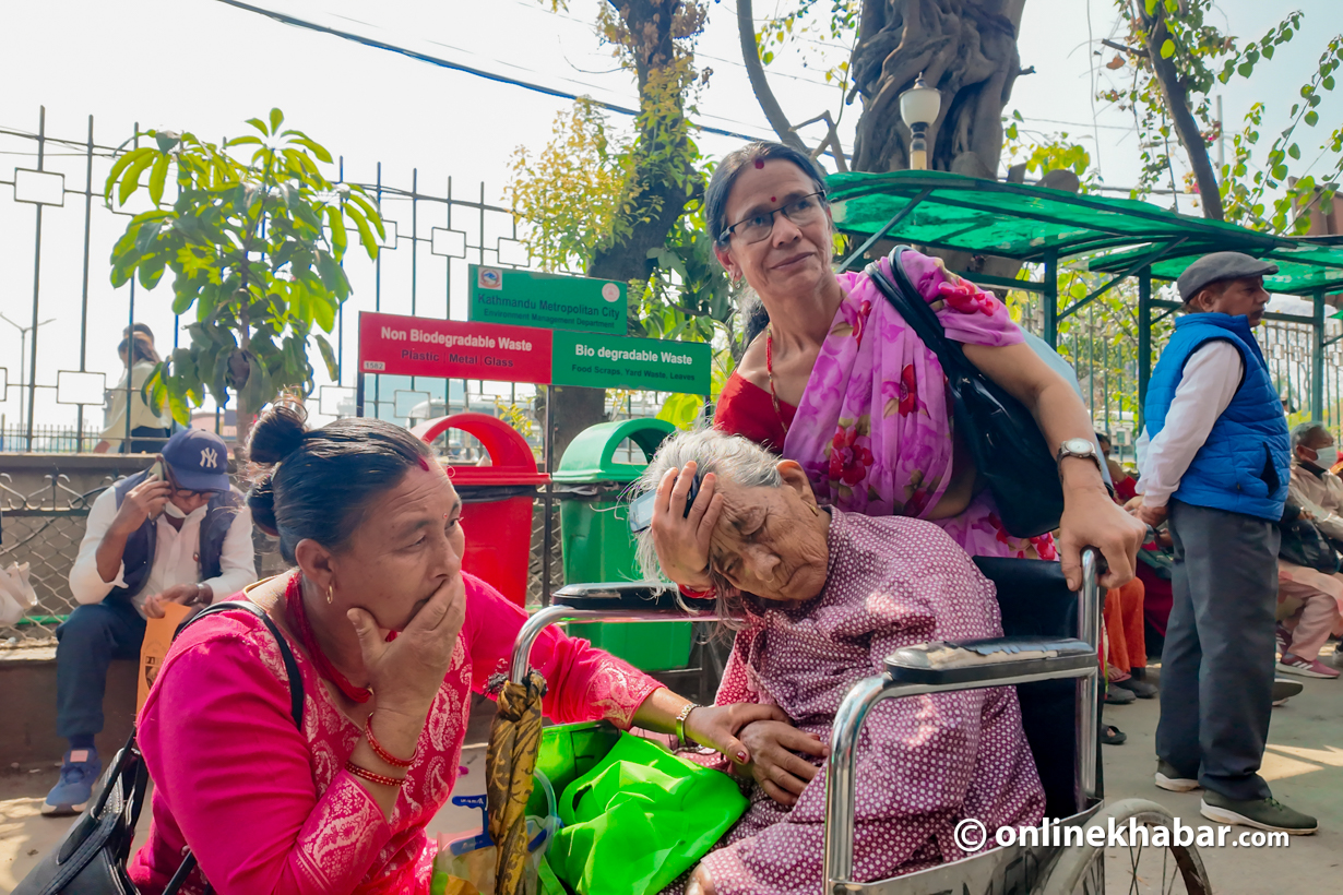 यसैबीच, अस्पतालको प्रांगणमा वृद्ध महिला ह्विलचियरमा देखिइन् । एक महिलाले टाउको समातेकी थिइन्, अर्कीले हात । ८० वर्षीय ती महिलालाई उच्च रक्तचापको समस्या छ ।