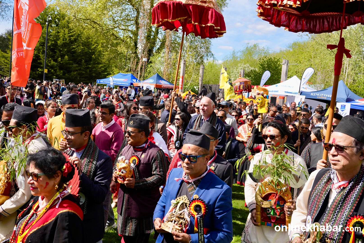 Generated by OK AI. Editorially reviewed.- लन्डनस्थित डार्टफोर्ड ओपन एयर थिएटर सेन्ट्रल पार्कमा १९ अप्रिलमा नेपाली समुदाय \'लन्डन बिस्का\' जात्रामा उत्साहपूर्वक सहभागी भएका छन् ।