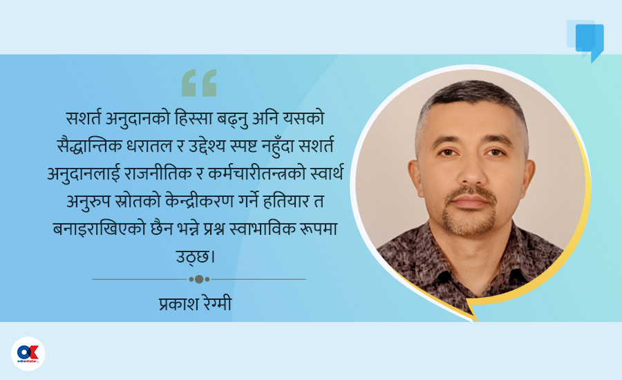 यस हिसाबमा संघीय सरकारको बजेटमा भएको वृद्धिको अनुपातमा अनुदानमा वृद्धि नहुनुलाई वित्तीय संघीयताको हिसाबले राम्रो मान्न सकिंदैन। कुल अनुदानमा सशर्त अनुदानको हिस्सा भने आर्थिक वर्ष २०७९/८० मा ४४ प्रतिशत रहेकोमा त्यसपछिका वर्षमा घटेर क्रमश: ३३ प्रतिशत अनि २६ प्रतिशत रहेकोमा चालु आव २०८२/८३ मा पुन: ३१ प्रतिशत पुगेको छ। यसप्रकार परिमाणात्मक रूपमा प्रदेशमा जाने अनुदान पछिल्ला वर्षमा बढेको देखिए तापनि समानीकरण अनुदानको हिस्सा निरन्तर बढाउने र सशर्त अनुदानको हिस्सा घटाउने आयोगको सिफारिस भन्दा उल्टो सशर्त अनुदानको हिस्सा बढ्नु अनि यसको सैद्धान्तिक धरातल र उद्देश्य स्पष्ट नहुँदा सशर्त अनुदानलाई राजनीतिक र कर्मचारीतन्त्रको स्वार्थ अनुरुप स्रोतको केन्द्रीकरण गर्ने हतियार त बनाइराखिएको छैन भन्ने प्रश्न स्वाभाविक रूपमा उठ्छ।
