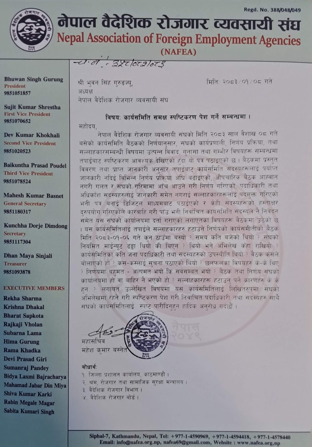 सल्लाहकार हटाउने निर्णय किन र कसरी गरियो, त्यसको आधार के हो भन्ने विषयमा पनि स्पष्ट पार्न भनिएको छ । कार्यसमितिले यी सबै विषयमा लिखित रूपमा स्पष्ट जवाफ पेश गर्न अध्यक्ष गुरुङलाई आग्रह गरेको छ ।