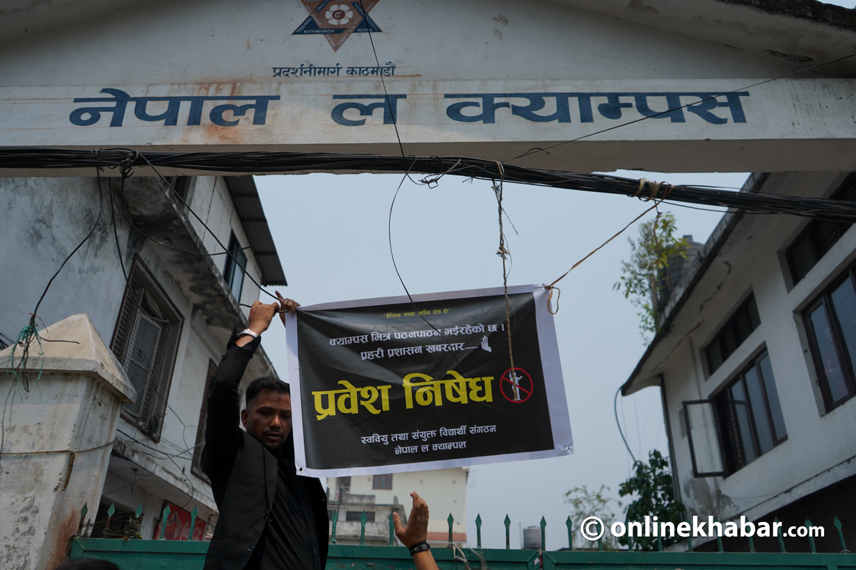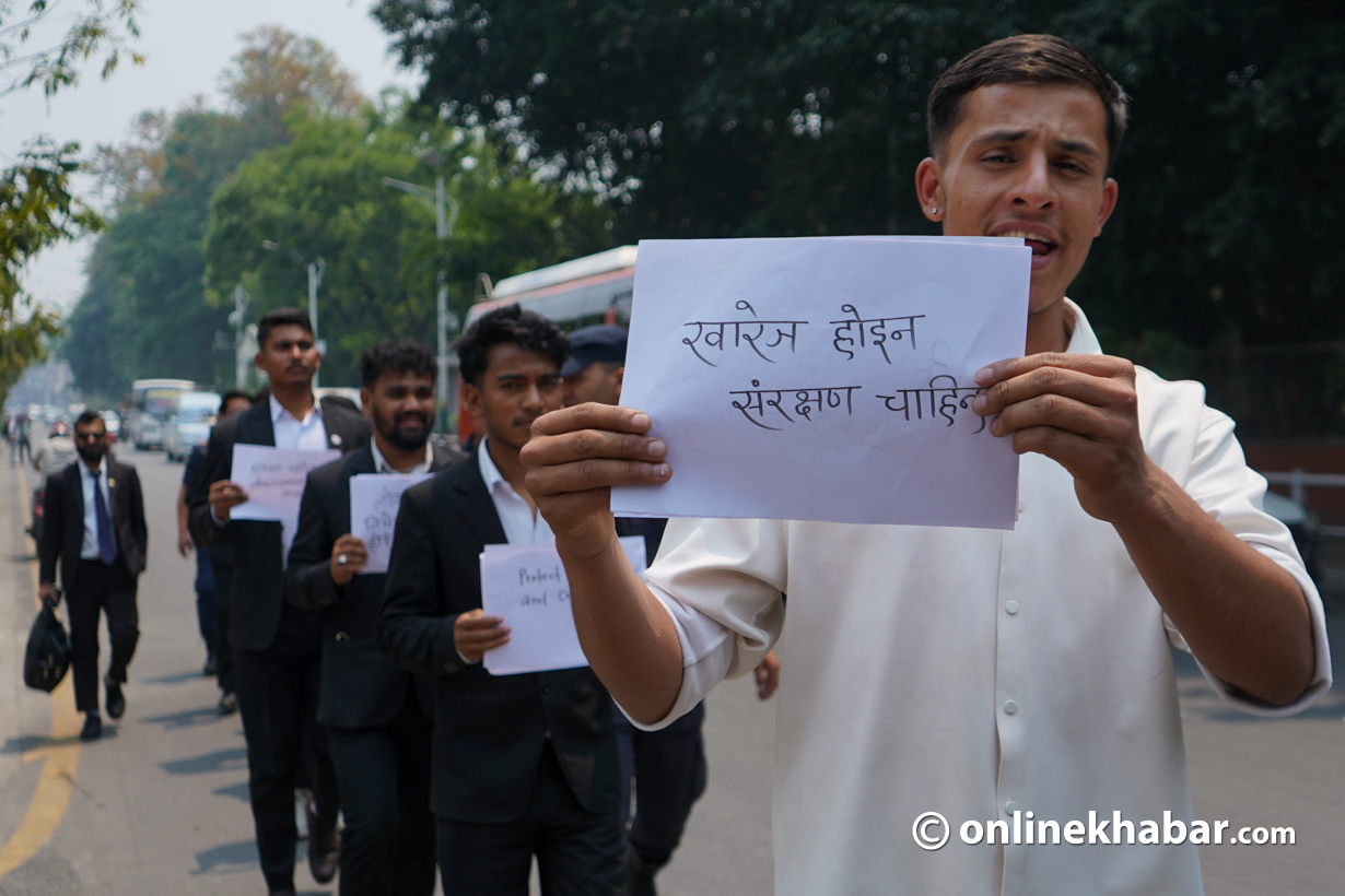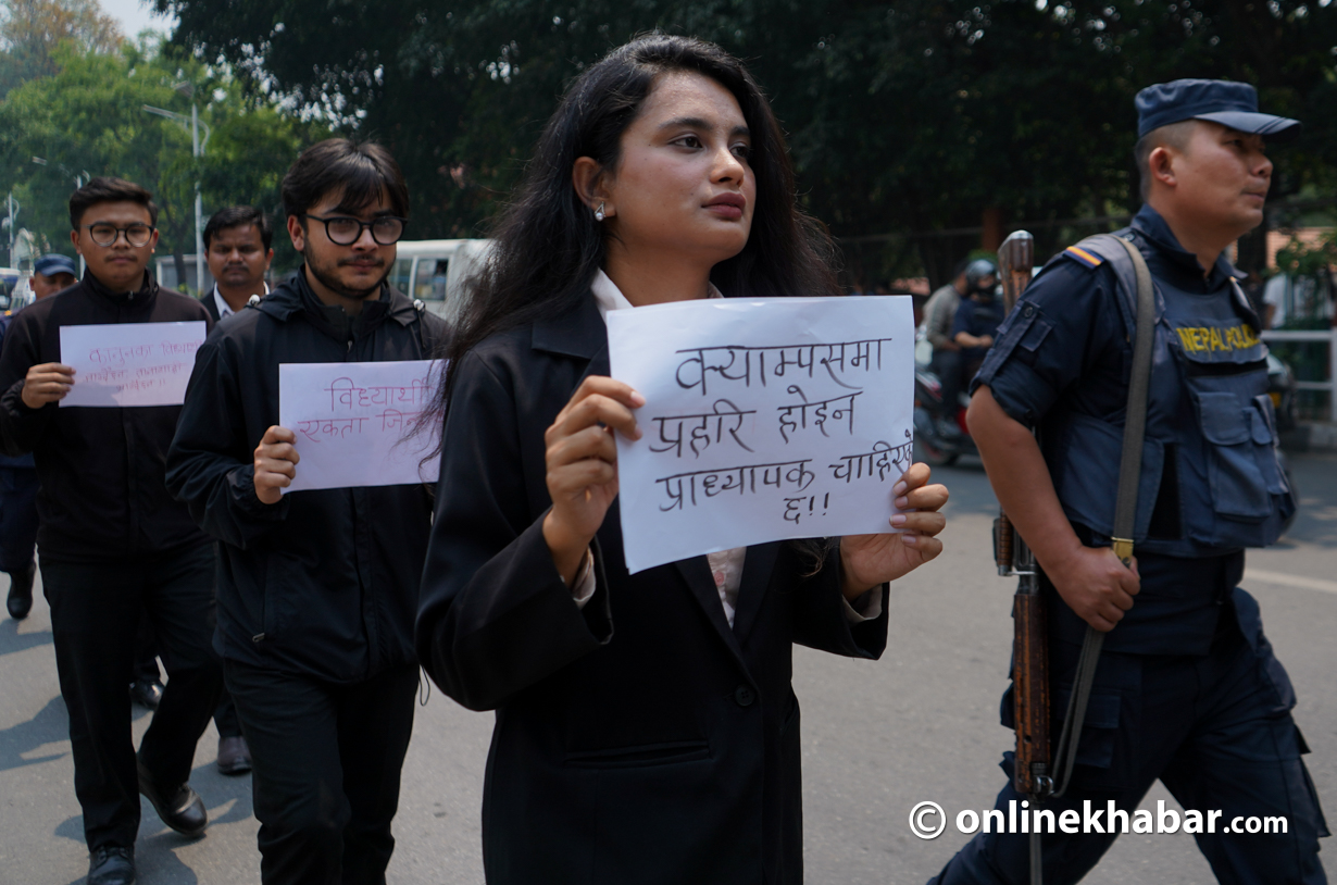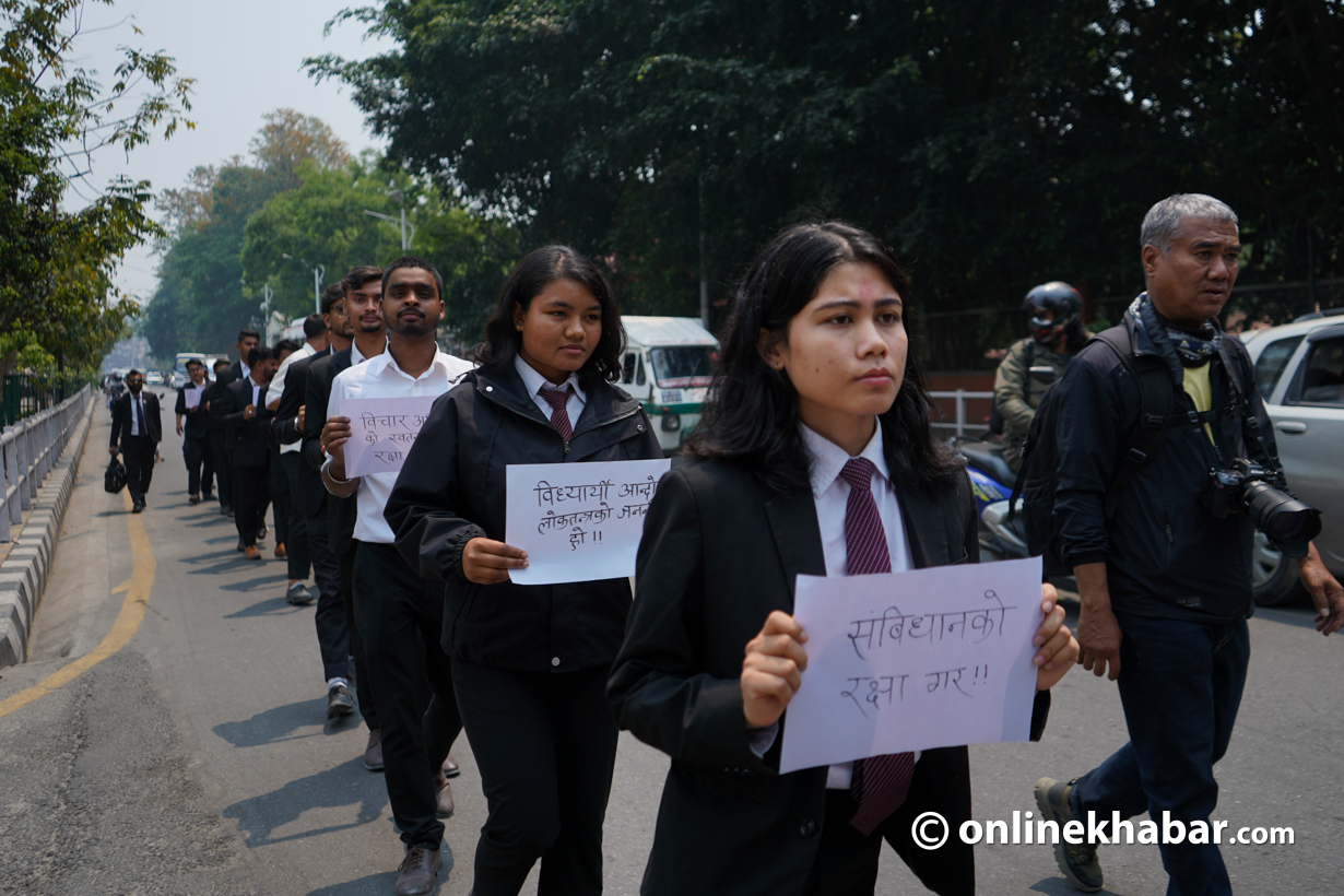 • कानुनका विद्यार्थीहरूले विश्वविद्यालयबाट विद्यार्थी संगठन हटाउने सरकारको निर्णयविरुद्ध काठमाडौंमा प्रदर्शन गरेका छन्।