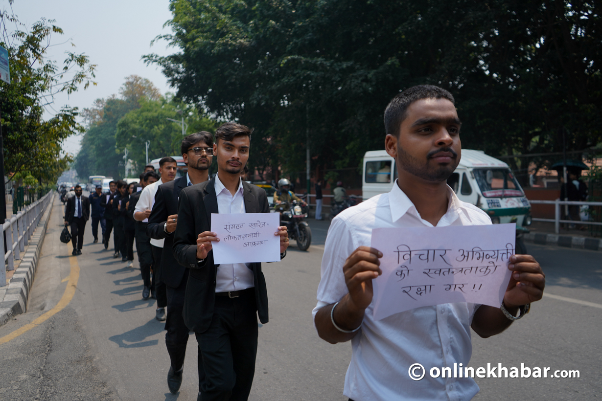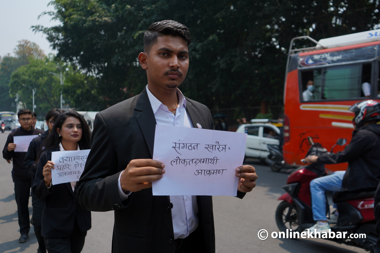 विश्वविद्यालयमा रहेका स्ववियु तथा विद्यार्थी संगठनहरूको अस्तित्व समाप्त पार्ने गरी चालिएको कदमलाई सरकारको अधिनायकतावादी कदम भन्दै कानुनका विद्यार्थीहरूले प्रदर्शन गरेका हुन् ।