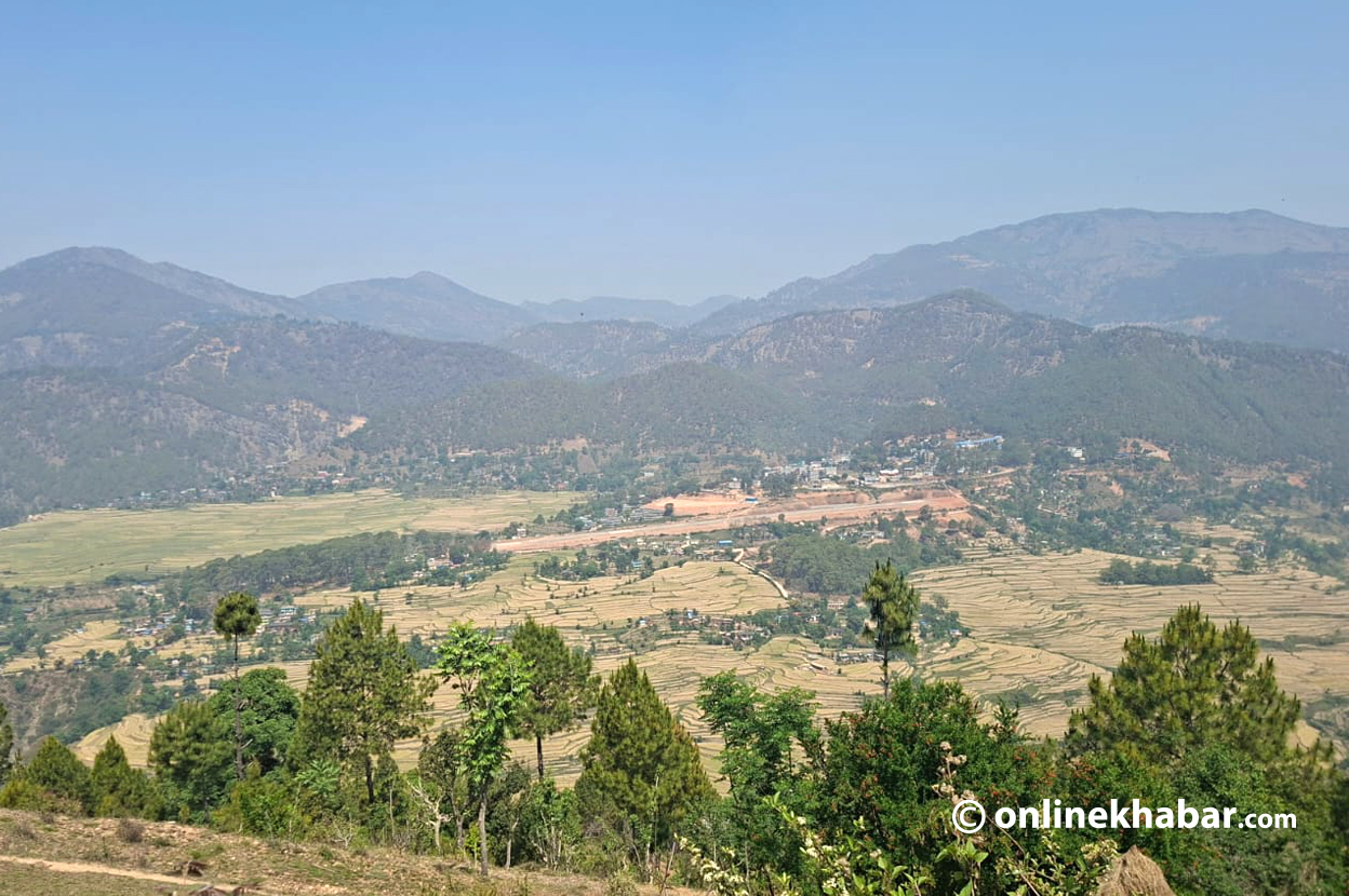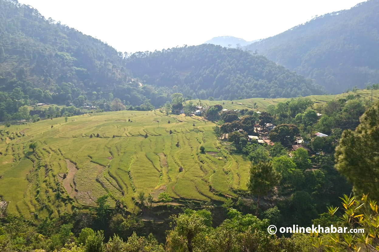 १० वैशाख, बैतडी । समथर फाँट, खेतको सिरानीमा लहरै मिलेका बस्ती । सरकारले घोषणा गरेका देशका १० नमुना शहरमध्ये बैतडीको पाटनसँग जोडिएका गाउँहरूको दृश्य हो यो ।