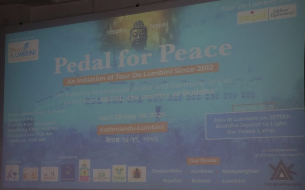 १० वैशाख, काठमाडौं । नेपालमा शान्तिको सन्देश फैलाउने उद्देश्यसहित ‘टुर डे लुम्बिनी : पेडल फर पीस २०२६’ आयोजना हुने भएको छ । टुर दी लुम्बिनीका संस्थापक मेघ आलेका अनुसार यही वैशाख १५ देखि १९ गतेसम्म काठमाडौंबाट लुम्बिनीसम्म साइकल यात्रा हुने भएको हो ।