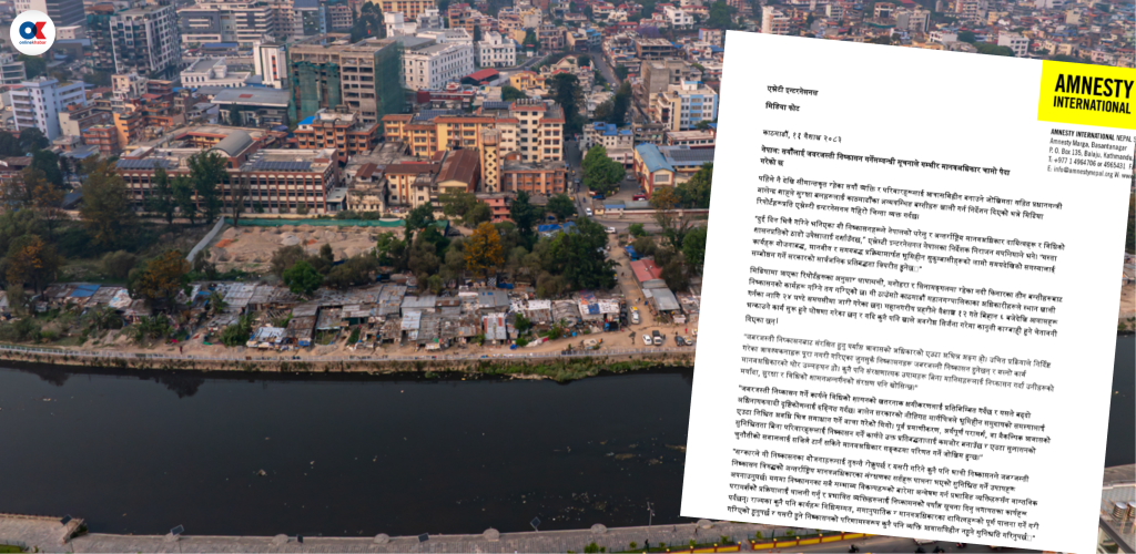 Generated by OK AI. Editorially reviewed.- एमनेस्टी इन्टरनेसनलले सरकारले काठमाडौंका सुकुमवासी बस्तीहरू जबरजस्ती खाली गर्ने योजना तत्काल रोक्न आग्रह गरेको छ।