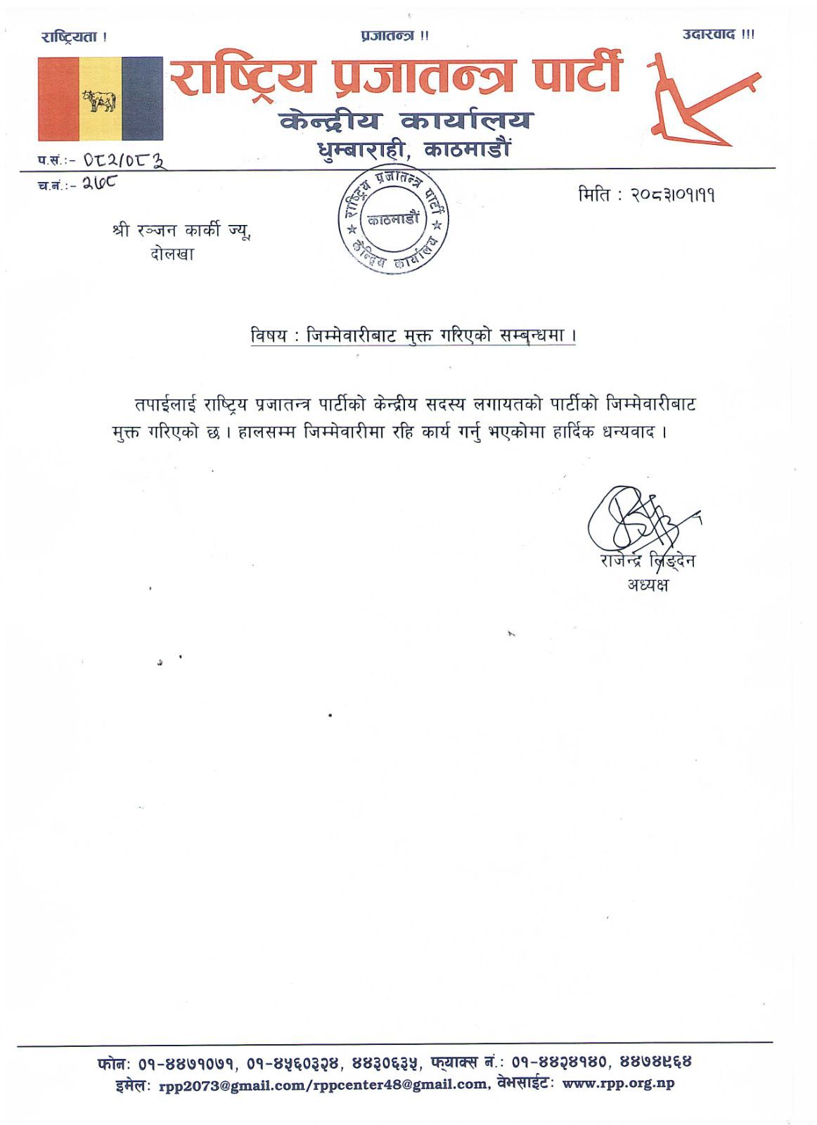 ‘तपाईंलाई राष्ट्रिय प्रजातन्त्र पार्टीको केन्द्रीय सदस्यलगायतको पार्टीको जिम्मेवारीबाट मुक्त गरिएको छ,’ लिङ्देनले कार्कीलाई लेखेको पत्रमा भनिएको छ,’हालसम्म जिम्मेवारीमा रही कार्य गर्नु भएकोमा हार्दिक धन्यवाद ।’