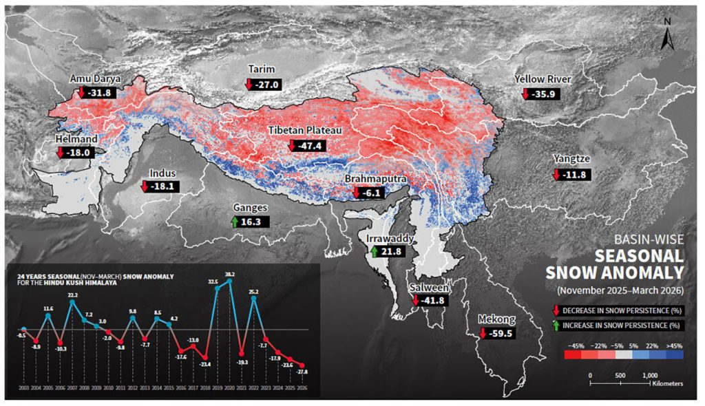 हिन्दूकुश हिमालय क्षेत्रबाट बहने १२ वटा प्रमुख नदी प्रणालीमध्ये १० वटामा यस वर्ष हिउँको उपलब्धता सामान्यभन्दा निकै कम छ । विशेषगरी मेकोङ नदीमा ५९.५ प्रतिशत, तिब्बती पठारमा ४७.४ प्रतिशत र साल्वीन नदीमा ४१.८ प्रतिशतसम्म हिउँ घटेको छ । मेकोङ, तारिम र तिब्बती पठारमा २४ वर्षयताकै सबैभन्दा कम हिउँ रेकर्ड गरिएको इसिमोडको प्रतिवेदनमा उल्लेख छ ।