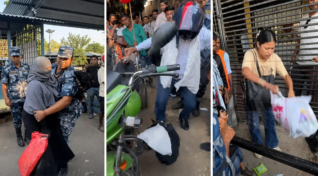 · सशस्त्र प्रहरीको कडाइबाट रिसाएकी एक महिला केही प्याकेट चाउचाउ र कुरकुरे भुइँमा फाल्छिन् । त्यो सामग्री बच्चालाई ल्याइदिएको उनी बताउँछन् ।