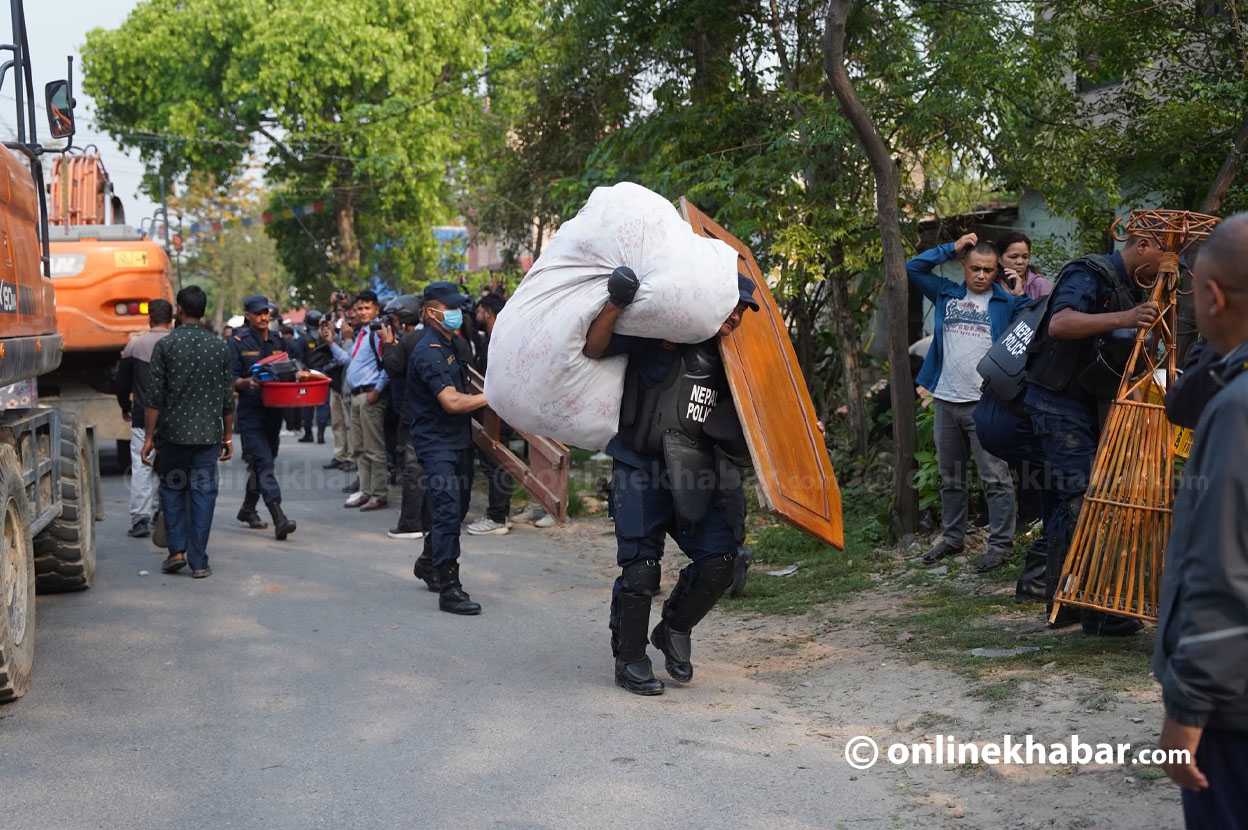 - डोजरले पानी पाइप फुटाउँदा सामान भिजे र बस्तीबासीहरू रोइरहेका थिए, प्रहरीले माइकिङ गर्दै सामान सुरक्षित रहेको जानकारी दिए।