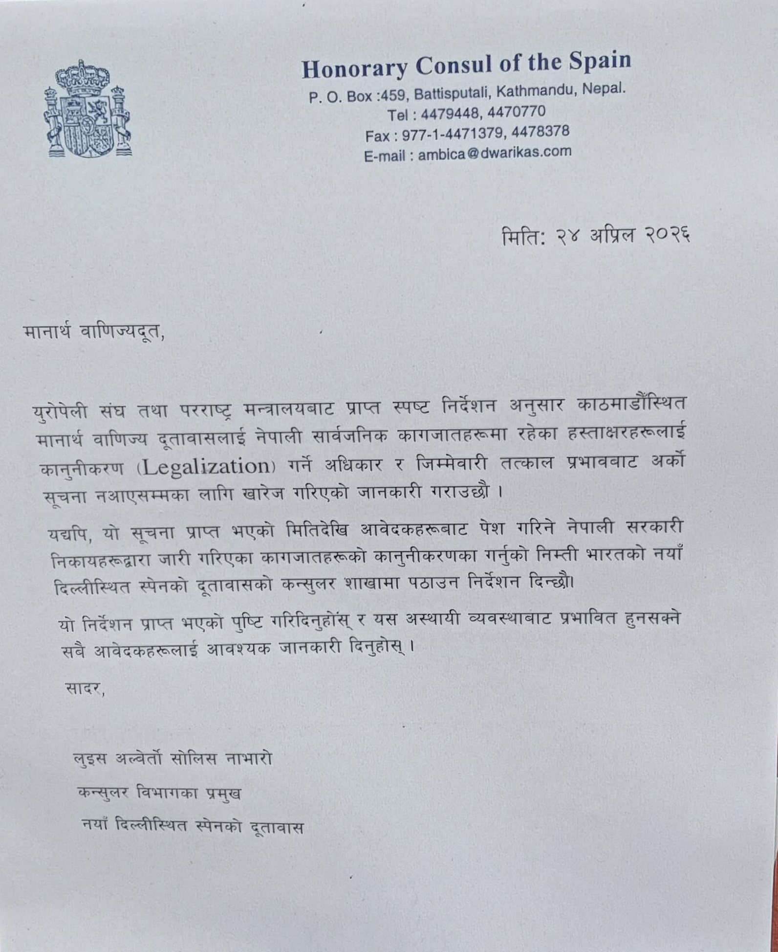 ‘युरोपेली संघ तथा परराष्ट्र मन्त्रालयबाट प्राप्त निर्देशनअनुसार नेपाली सार्वजनिक कागजातहरूमा रहेको हस्ताक्षरको कानुनीकरण गर्ने अधिकार र जिम्मेवारी तत्काल प्रभावबाट अर्को सूचना नआएसम्मका लागि खारेज गरिएको छ’, काठमाडौंस्थित स्पेनिश कन्सुलेट कार्यालयले २४ अप्रिल २०२६ मा जारी गरेको सूचनामा उल्लेख गरेको छ।