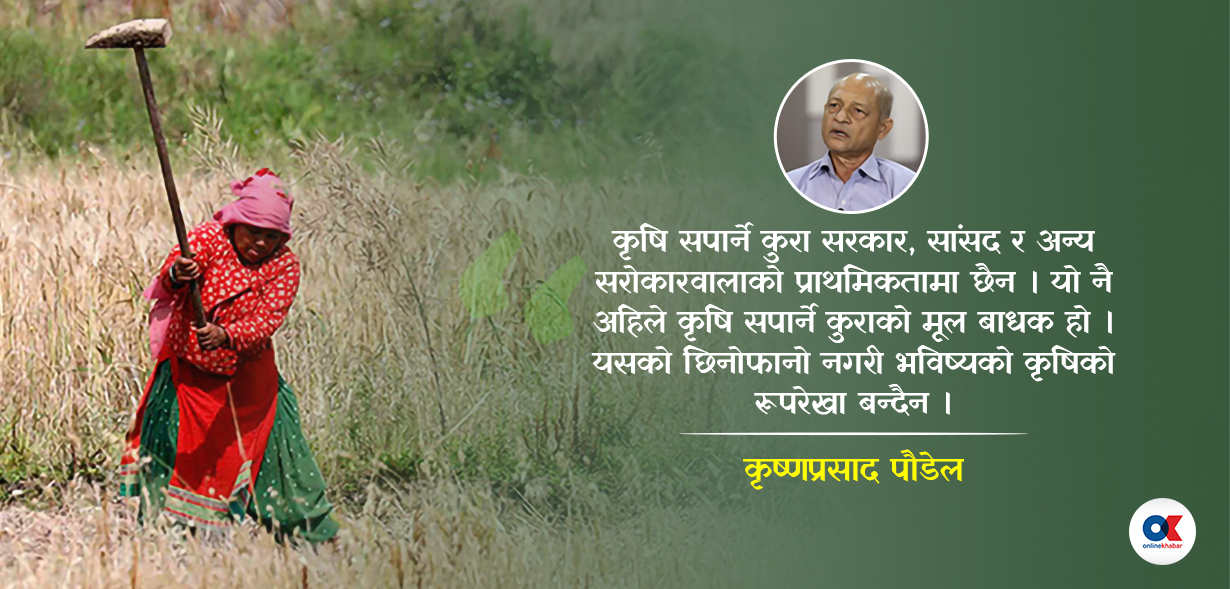 नेपाली कृषिले अब कसरी खुट्टा टेक्छ? नटेके के हुन्छ? जवाफ चाहिएको छ। यसरी लतारिएको कृषिलाई खुट्टा टेकाएर उन्नत बनाउने जिम्मा अब नयाँ सरकारको काँधमा आएको छ। विडम्बना, पुरानाबाट त आश छैन तर ‘पहिलो गाँसमै ढुङ्गा’ भने झैं नयाँले पनि कृषि सपार्ने छाँट देखाएका छैनन्। शासन र आसन विषाक्त रहेको देख्ने सरकारले खेतीपाती बिग्रेको अझै देखेको छैन। यसले शहरी उपभोक्ता, उपजको मूल्य, व्यापार र बजार मात्र सम्झियो। हाम्रो खानाको बन्दोबस्त गर्ने श्रमिक किसान, माटो र खेती सम्झन कञ्जुस्याइँ गरेको छ।