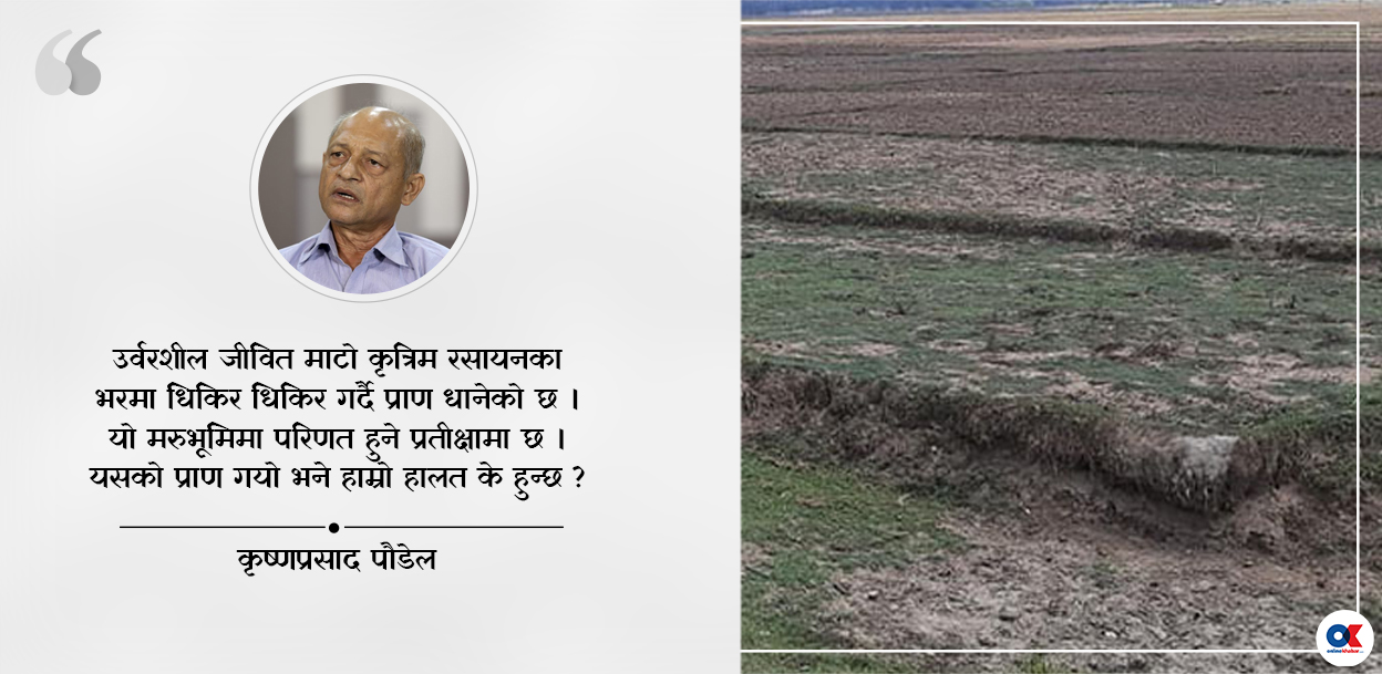 सँगै, अहिले भइरहेको कृत्रिम रसायन र विषादीमा आधारित खेतीपाती र यसबाट आउने खाना विषाक्त छ भनेर दोहोर्याउनुपर्दैन होला। नसर्ने दीर्घ रोगका समस्याले आक्रान्त घरपरिवार, आफन्त र सिङ्गो समाज भयभीत एवं आतंकित छ। अस्पतालको भीडभित्र लुकेका आम मानिसका पीडाले सबै कुरा ओकलिरहेका छन्।