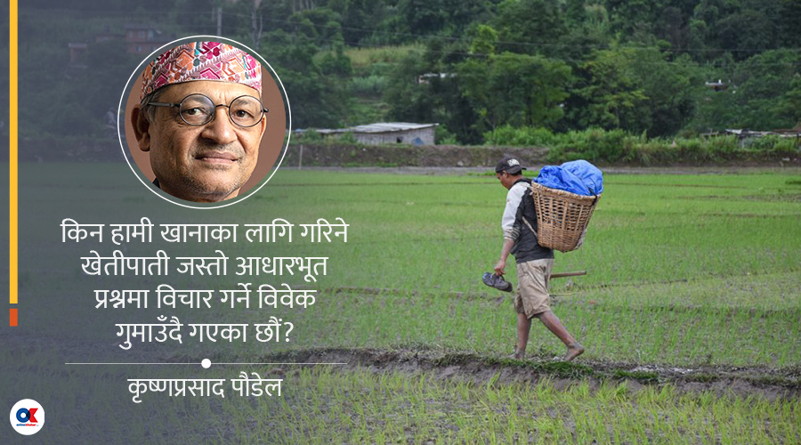 खाना र खेतीपातीको दुरुह अवस्था र यसका अन्तर्निहित कारणले समाजको समग्र चेतनामाथि गम्भीर प्रश्न उठिरहेको छ। हामी सबैलाई थाहा छ, खानामा परनिर्भर समाज आत्मनिर्भर र स्वाभिमानी हुन सक्दैन। हाम्रो विशेषताको यथार्थ धरातलमा टेक्न नसकेको स्वच्छ कृषि विकासको भविष्यमुखी दृष्टिकोण नहुनु नै यी सबै संकटको मूल कारक हो। यो कुरा आत्मसात् गरेर कृषि विकासको ढाँचा र अभ्यास नगरे हाम्रो कृषि जोगिंदैन।