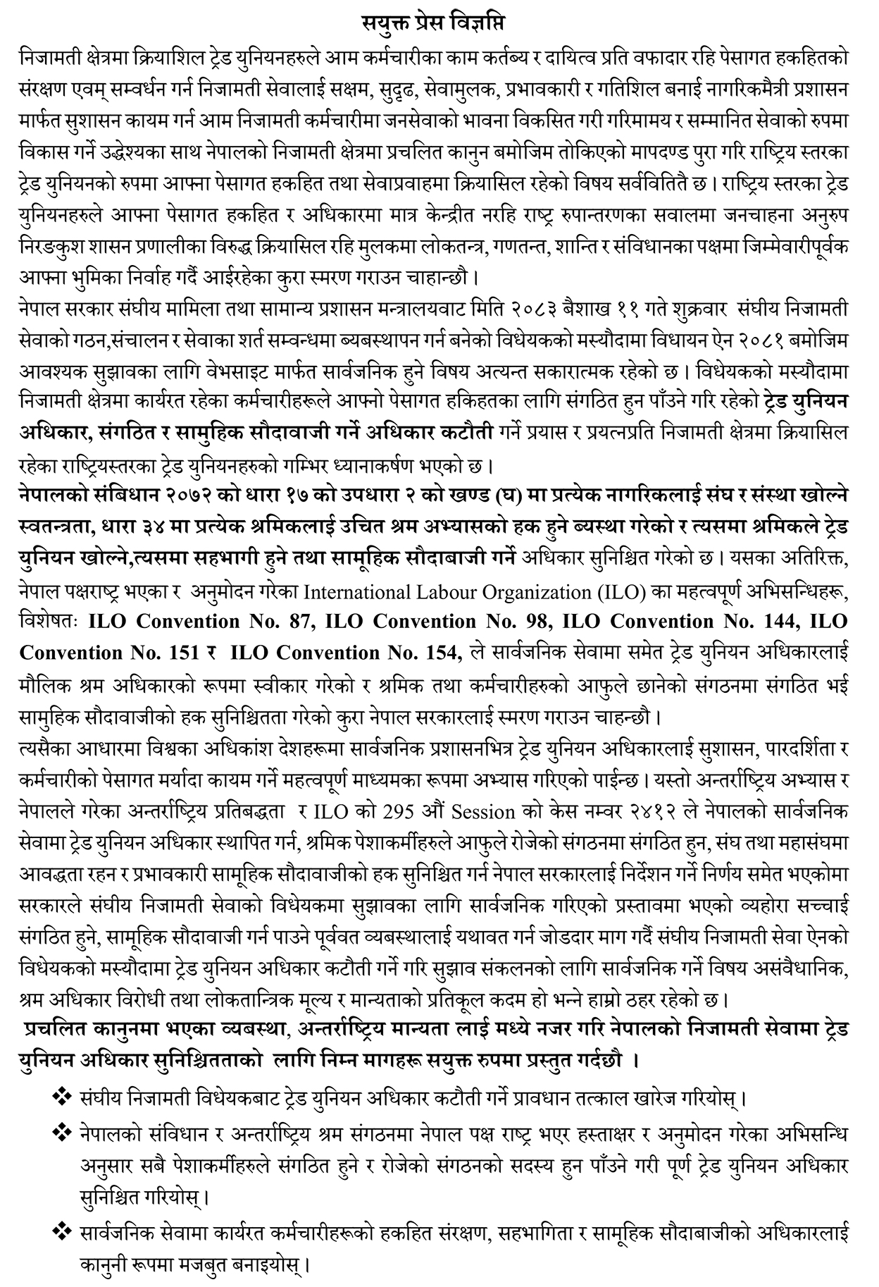उनीहरुले संयुक्त विज्ञप्तिमार्फत सार्वजनिक सेवामा कार्यरत कर्मचारीको हकहित संरक्षण, सहभागिता र सामूहिक सौदाबाजीको अधिकारलाई कानुनी रूपमा मजबुत बनाउनसमेत आग्रह गरेका छन् ।