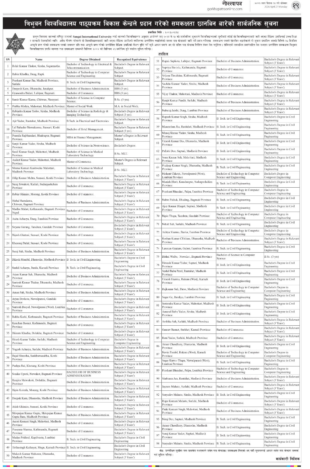 Generated by OK AI. Editorially reviewed.- त्रिभुवन विश्वविद्यालयले भारतस्थित सङ्गाई इन्टरनेशनल युनिभर्सिटीबाट अध्ययन गरेका ९८ जनालाई ३५ दिनभित्र वैधता पुष्टि गर्ने कागजात पेश गर्न अल्टिमेटम दिएको छ।