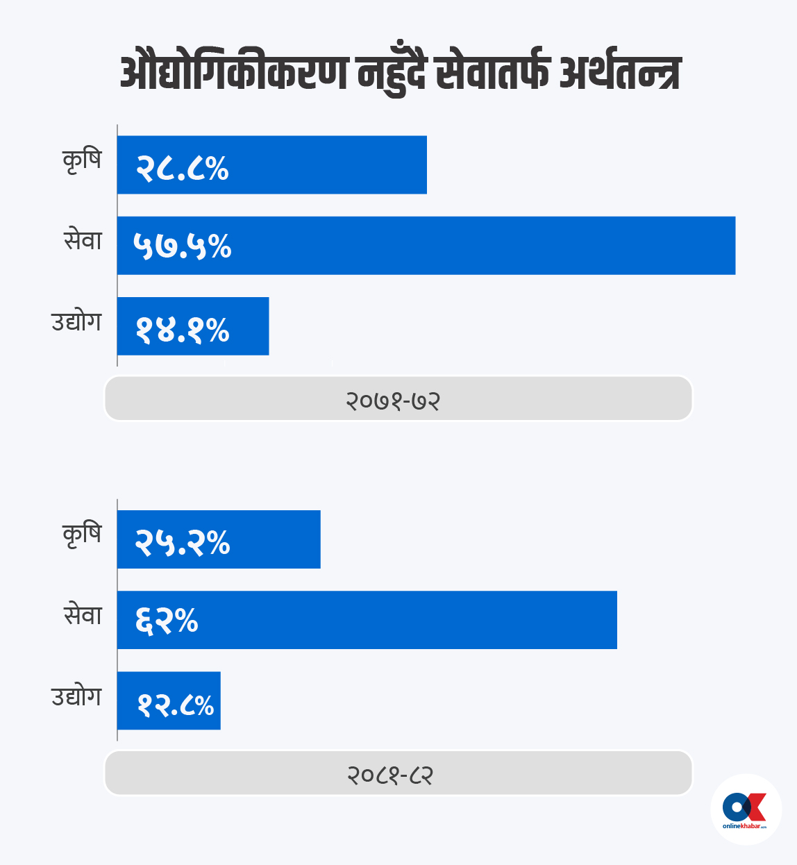 अर्थतन्त्र कृषिबाट औद्योगिकीकरण नहुँदै सेवा क्षेत्रमा विस्तार हुँदा आय र उत्पादकत्व बढाउन नसकिएको अर्थले लेखेको छ । अर्थतन्त्र परम्परागत कृषिमा आधारित रहेको उल्लेख गर्दै अर्थ मन्त्रालयले यस क्षेत्रको वृद्धिदर एक दशकमा औसत ३ प्रतिशतमात्र रहेको बताएको छ ।