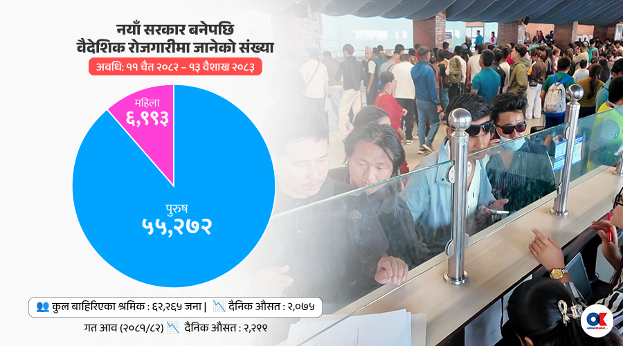 Generated by OK AI. Editorially reviewed.- नयाँ सरकार गठन भएको एक महिना बित्दा पनि वैदेशिक रोजगारीमा जाने युवाको संख्या ६२ हजार २ सय ६५ पुगेको छ।