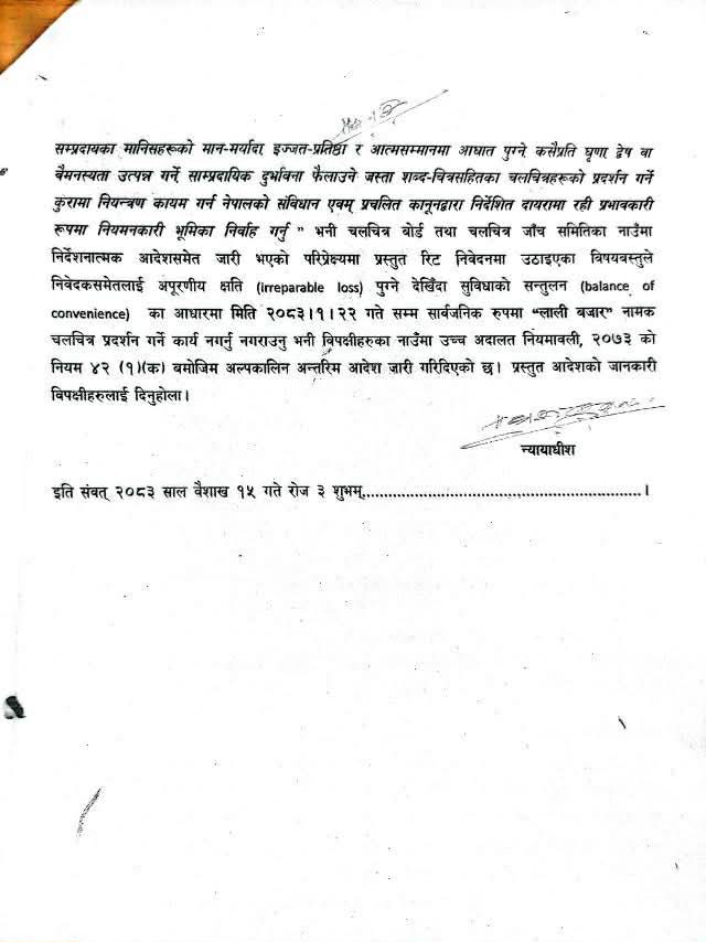 • उच्च अदालत पाटनले चलचित्र ‘लालीबजार’ को प्रदर्शन २२ वैशाखसम्म रोक्न आदेश दिएको छ।