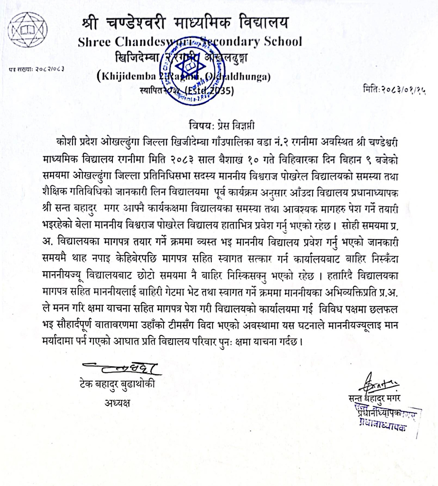 ‘वैशाख १० गते बिहीबारका दिन बिहान ९ बजेको समयमा ओखलढुंगा जिल्ला प्रतिनिधिसभा सदस्य माननीय विश्वराज पोखरेल विद्यालयको समस्या तथा शैक्षिक गतिविधिको जानकारी लिन विद्यालयमा पूर्व कार्यक्रम अनुसार आउँदा विद्यालय प्रधानाध्यापक श्री सन्तबहादुर मगर आफ्नै कार्यकक्षमा विद्यालयका समस्या तथा आवश्यक मागहरू पेस गर्ने तयारी भइरहेको बेला माननीय विश्वराज पोखरेल विद्यालय हाताभित्र प्रवेश गर्नु भएको रहेछ । सोही समयमा प्रअ विद्यालयका मागपत्र तयार गर्ने क्रममा व्यस्त भई माननीय विद्यालय प्रवेश गर्नु भएको जानकारी समयमै थाह नपाई केहिबेरपछि मागपत्र सहित स्वागत सत्कार गर्न कार्यालयबाट बाहिर निस्कँदा माननीयज्यू विद्यालयबाट छोटो समयमा नै बाहिर निस्किसक्नु भएको रहेछ,’ विज्ञप्तिमा भनिएको छ ।