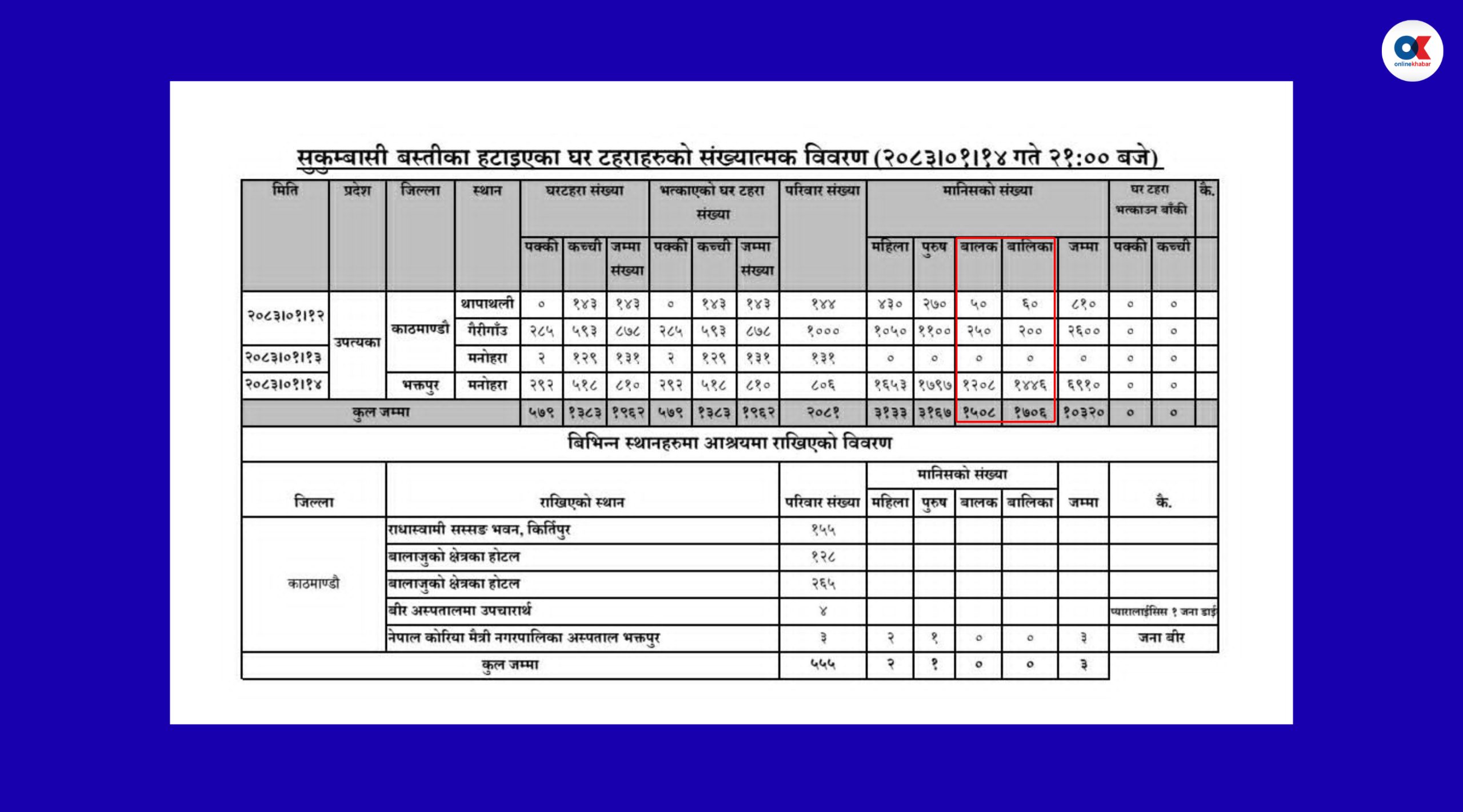 Generated by OK AI. Editorially reviewed.- सरकारले काठमाडौं उपत्यकाका सुकुमवासी बस्तीहरू हटाएपछि करिब ३ हजार बालबालिका विद्यालय जान नपाएको समस्या देखिएको छ।