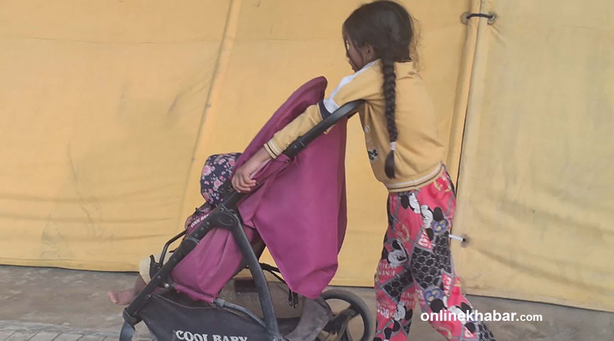 ‘उ त्यो हो मेरो घर,’ गेटबाट छिर्ने बित्तिकै कक्षा ६ मा पढ्ने तबिताले आफ्नो अस्थायी घर देखाउँदै भनिन्, ‘थापाथलीको घर भत्कायो । यही हो हाम्रो घर ।’