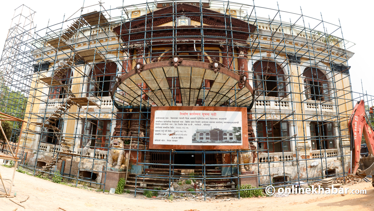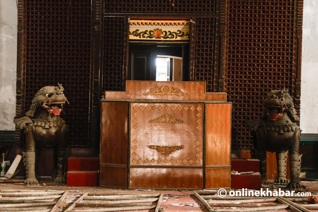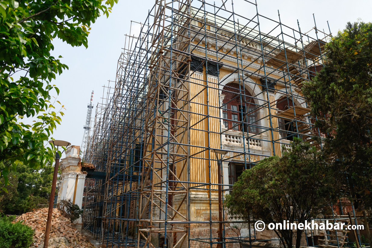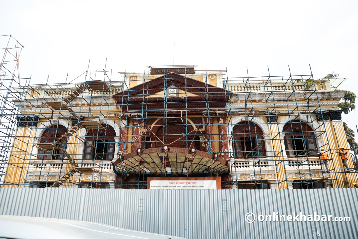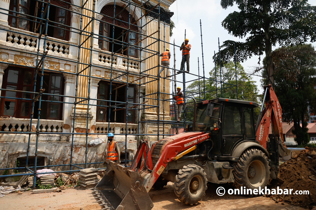 १५ वैशाख, काठमाडौं । सिंहदरबारभित्र रहेको ग्यालरी बैठक भवनको प्रवलीकरण (रेट्रोफिटिङ) कार्य धामधम भइरहेको छ ।