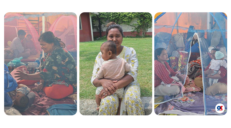 आमा भएर बच्चाको स्याहार गर्नु आफैंमा गाह्रो काम हो । तर अस्थायी आश्रयको भीडभाडमा त्यो झनै कठिन बनेको छ ।