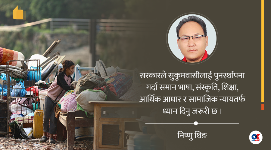 बिचल्ली र बेघर बनाएका सुकुमवासीलाई राज्यले भरोसा दिनुपर्ने ऐतिहासिक दायित्व छ। सुकुमवासी पुनर्स्थापना गर्दा भाषा र सांस्कृतिक पक्षलाई पनि विचार गर्न अत्यन्त जरूरी छ ।