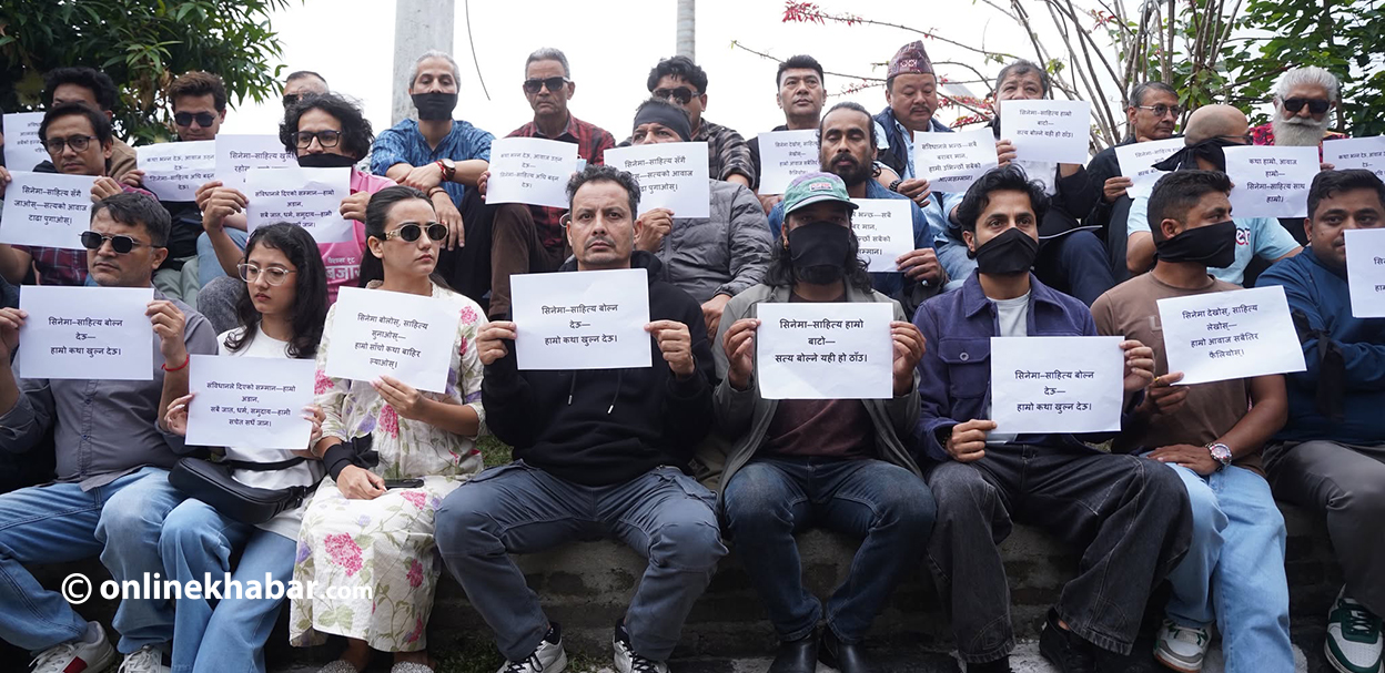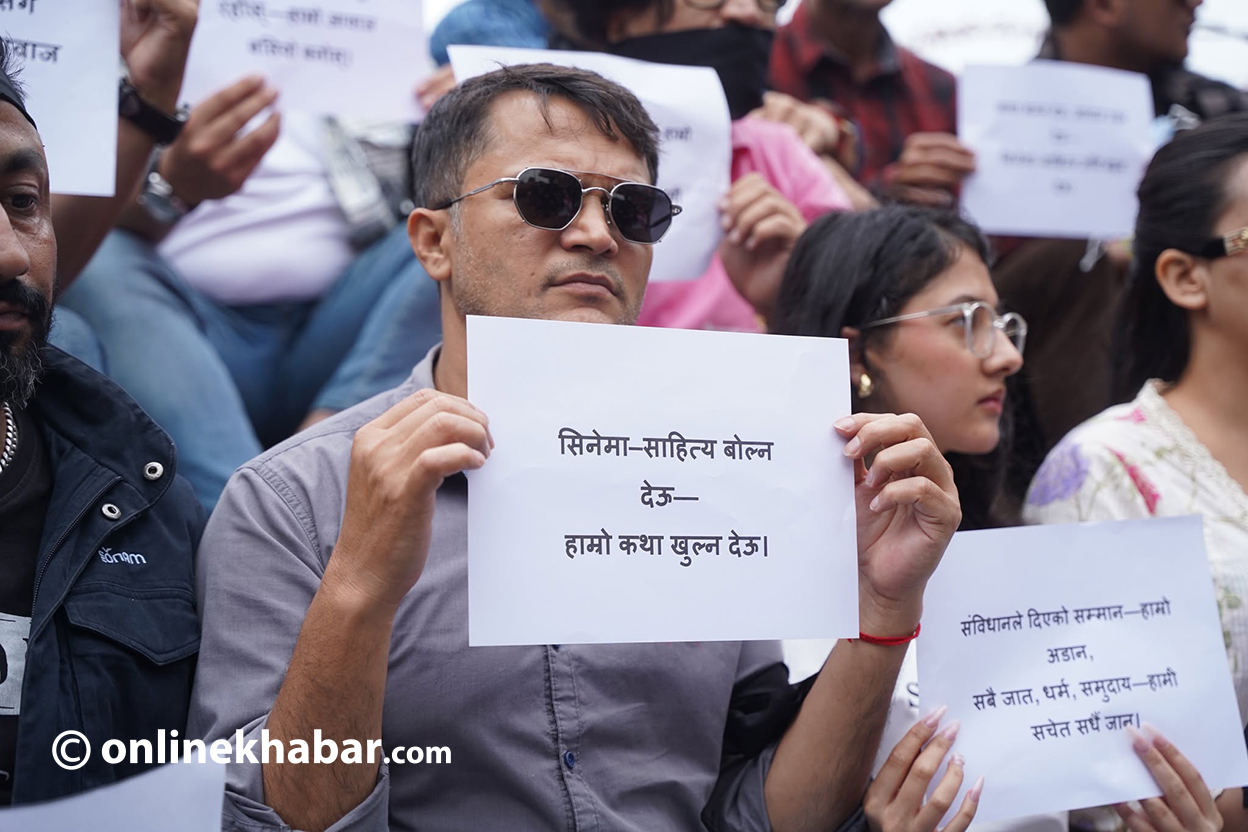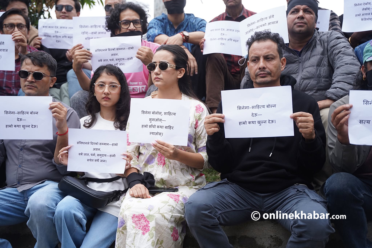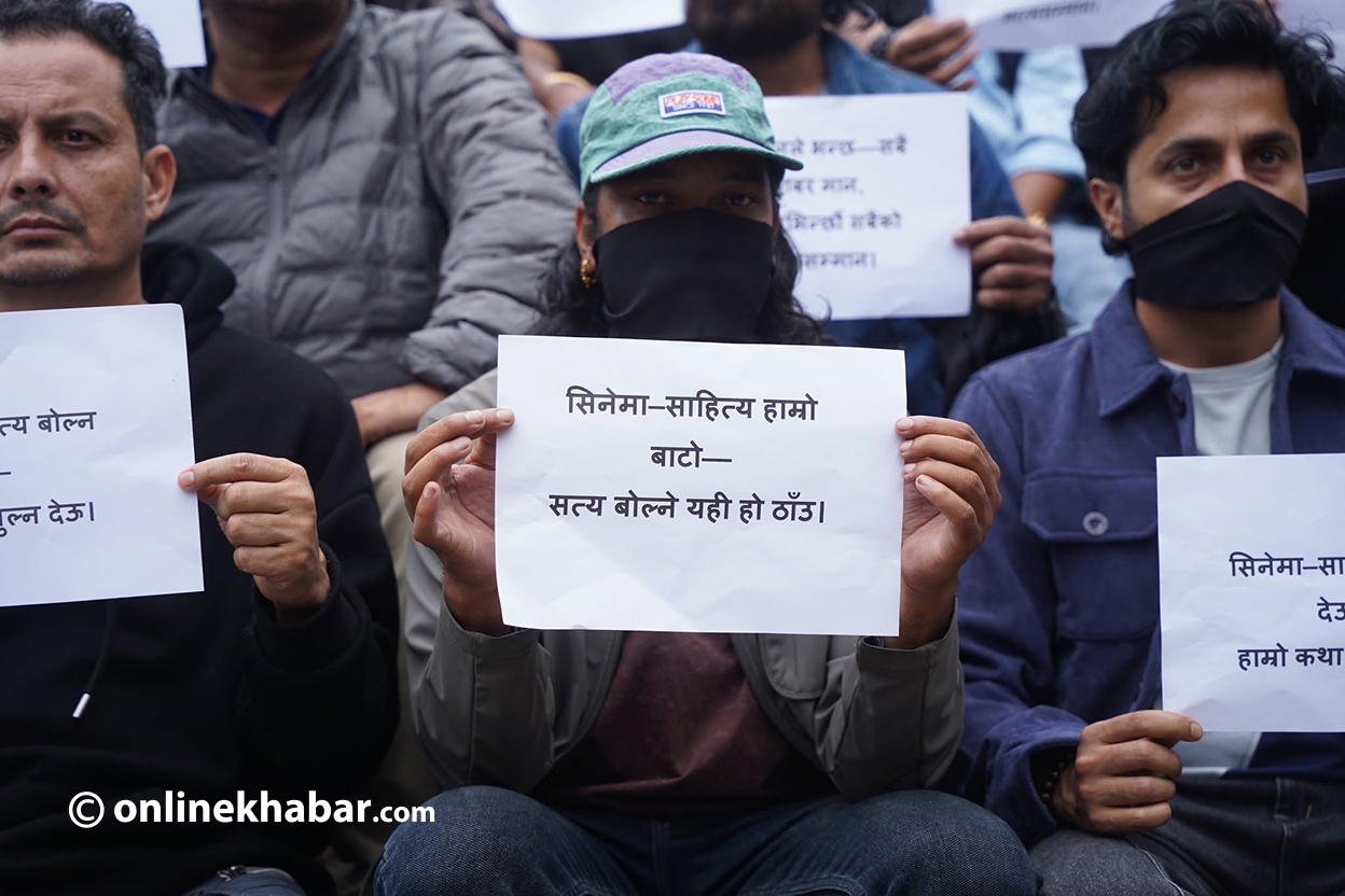 ‘सिनेमा बोलेस, साहित्य सुनाओस्, हाम्रो साँचो कथा बाहिर ल्याओस्’, ‘सिनेमा–साहित्य बोल्न देऊ, हाम्रो कथा खुल्न देऊ’, ‘संविधानले दिएको सम्मान–हाम्रो अडान, सबै जात, धर्म, समुदाय–हामी सचेत सधैं जान’जस्ता नारा लेखिएका प्लेकार्ड प्रदर्शन गरेका थिए ।