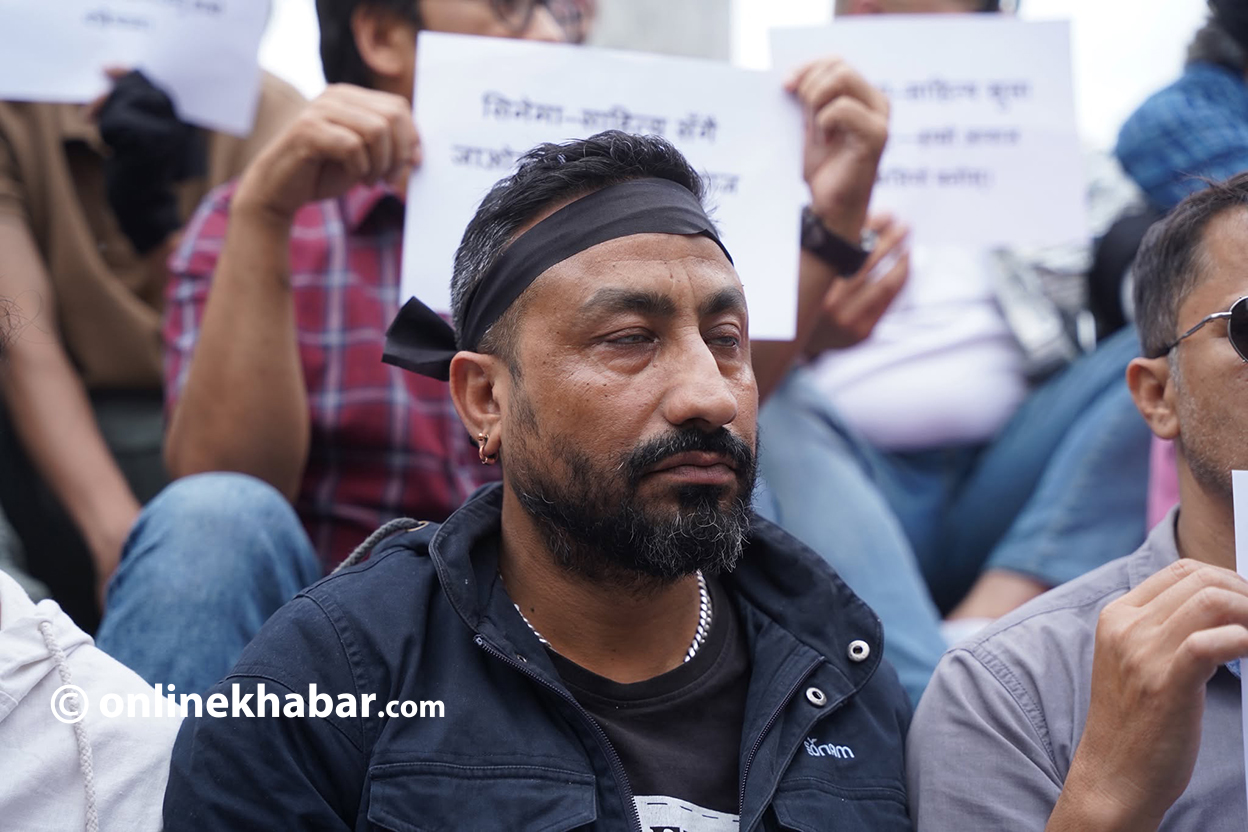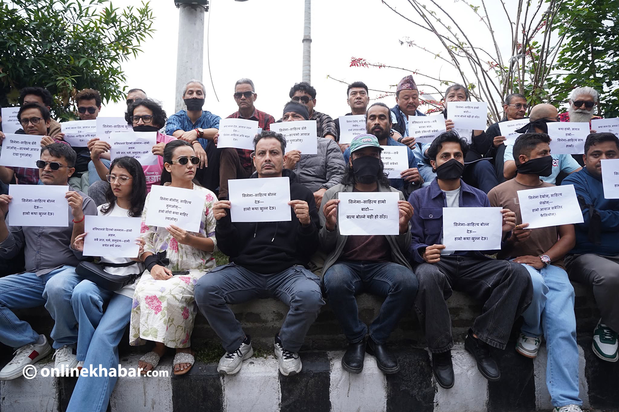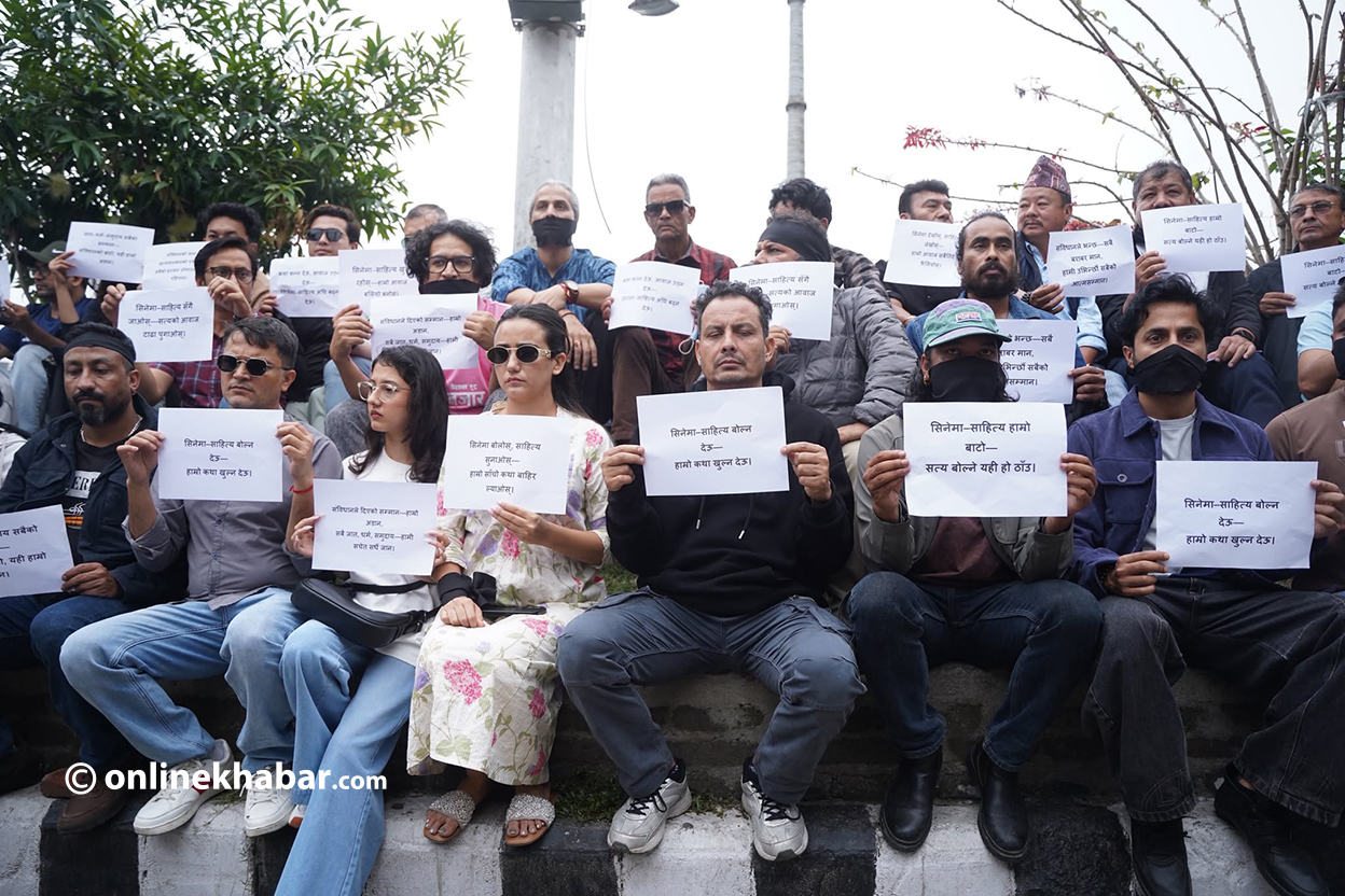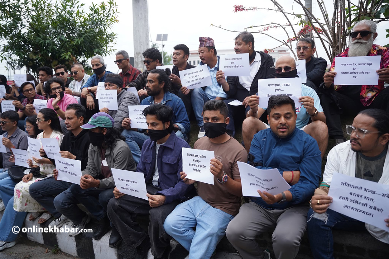 Generated by OK AI. Editorially reviewed.- चलचित्रकर्मीले माइतीघर मण्डलामा अभिव्यक्ति स्वतन्त्रताको पक्षमा प्रदर्शन गरेका छन्।